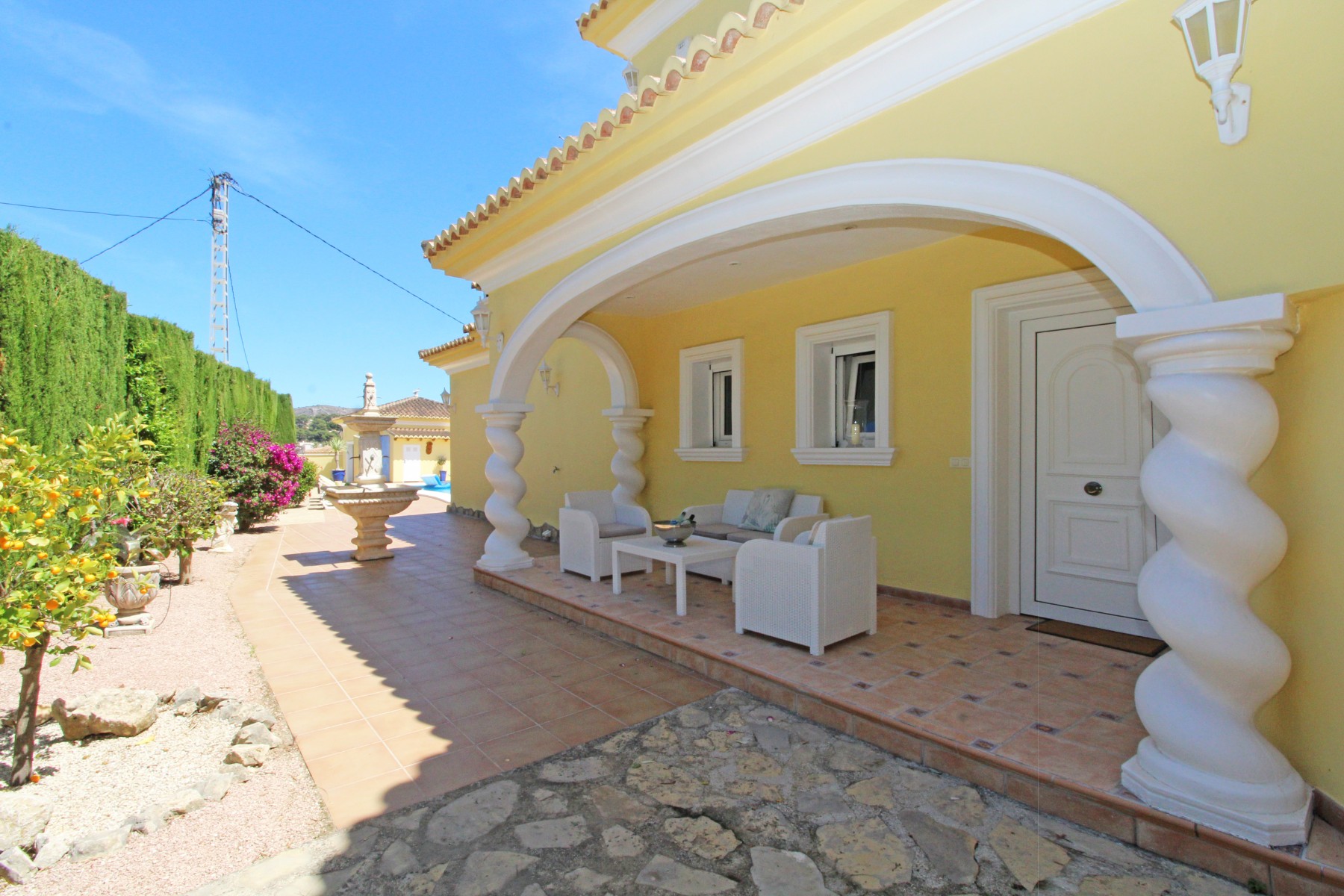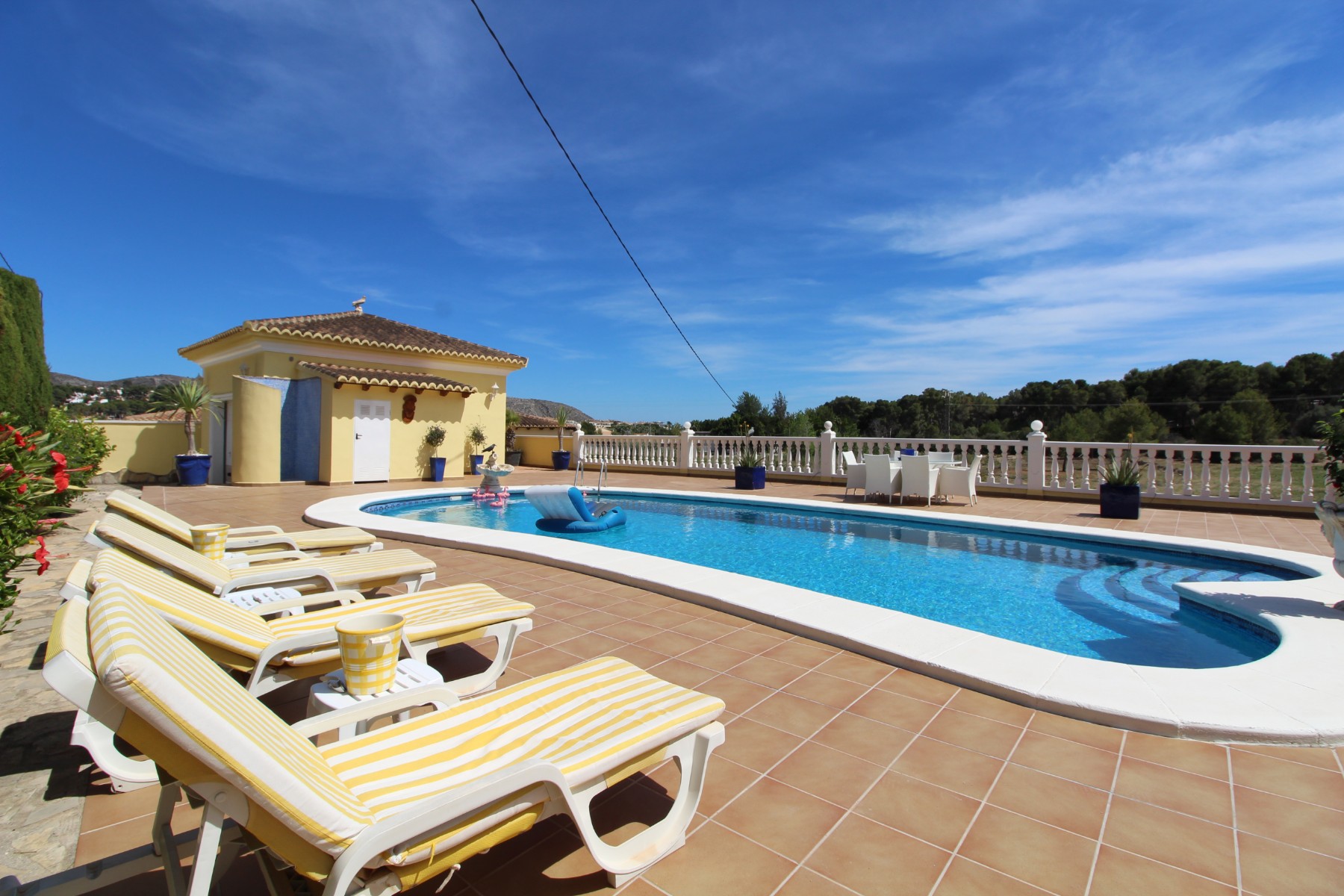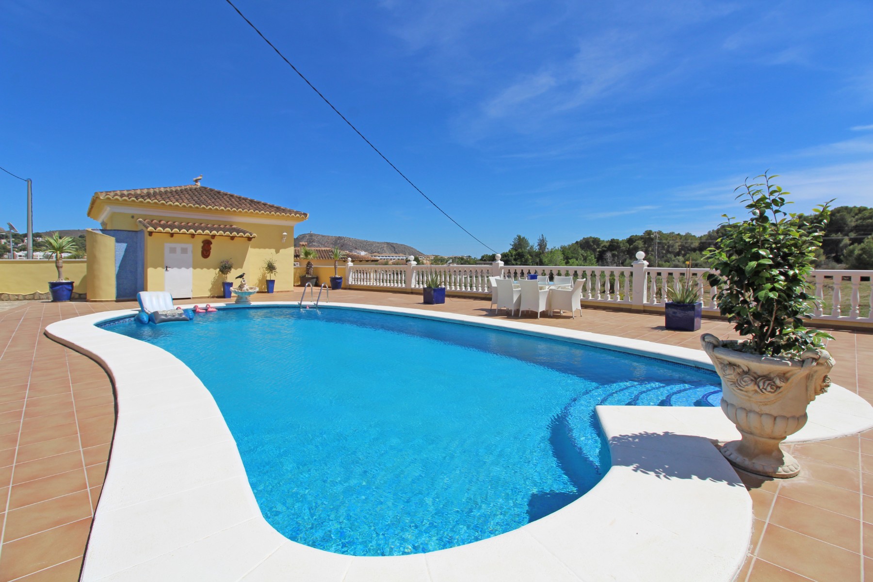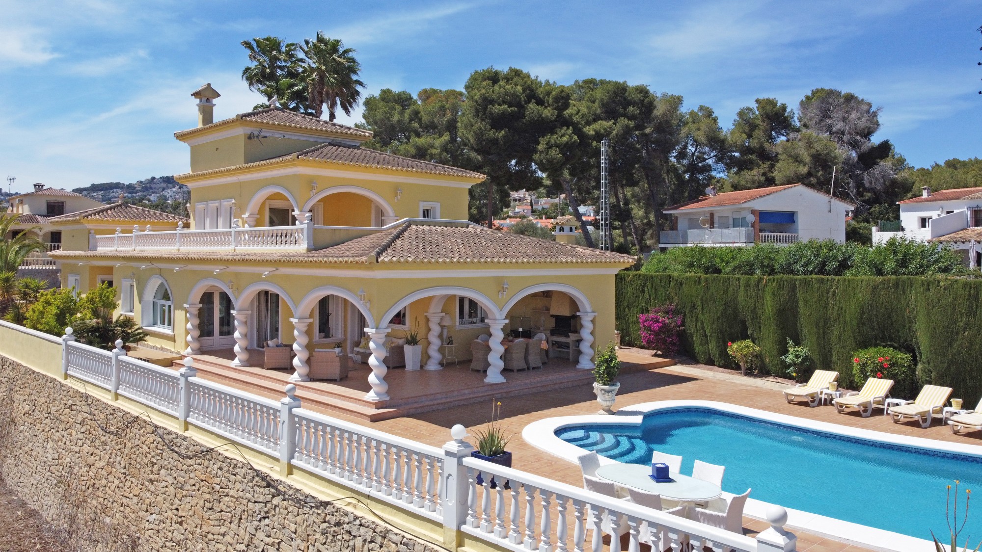 Discover this exceptional villa, ideally located just a 5-minute walk from both the beach and the village in Moraira. Upon entering the beautiful foyer, you will be greeted by an impressive entrance with double doors leading to the spacious living and dining room, adorned with a marble fireplace mantle with a gas fireplace and a custom-made wall unit, offering both comfort and elegance. A sliding door provides access to the covered terrace, seamlessly blending indoor and outdoor living. To the left of the foyer, a hallway leads to the fully equipped kitchen with ceramic hob, fridge-freezer, and dishwasher. From the kitchen, you can access the covered terrace and another terrace. This hallway also houses the utility room with washing machine and a guest toilet. To the right of the foyer, you will find built-in wardrobes, a storage room, a bathroom with bathtub, a spacious guest room with a sitting area and access to a covered terrace, as well as another large bedroom with ample closet space and an en-suite bathroom with bathtub. The impressive marble staircase from the foyer leads to the upper floor where the master bedroom awaits, complete with a walk-in closet and an en-suite bathroom with walk-in shower and bathtub. This bedroom offers access to a large covered and open terrace, ideal for enjoying the views. Step into the luxury lifestyle through the covered terrace on the ground floor, featuring a lounge and barbecue area complete with dining table, all overlooking the expansive 6 x 12m swimming pool. Surrounding the pool is a large south-facing terrace, with plenty of space for multiple sun loungers, ensuring relaxation under the Mediterranean sun. Access to the spacious garage, equipped with an automatic sectional door, is seamlessly facilitated through the automatic entrance gate. Additionally, you can enjoy the convenience of an outdoor shower. There is also a technical room for the pool. This beautiful property is equipped with gas central heating (gas tank), providing year-round comfort, along with air conditioning for added convenience. Take advantage of the benefits of double glazing and automatic shutters in the bedrooms, providing both insulation and security. LED recessed lighting adorns the interior, creating a welcoming atmosphere. Effortlessly control the pedestrian gate, automatic gate, and garage door from the house. Furthermore, you can rest assured knowing that the property is secured with a connected alarm system. To promote both safety and aesthetics, the entire plot is illuminated with outdoor lighting, while the villa is embraced by carefully maintained Mediterranean gardens, adorned with mature trees. Enjoy the beauty of nature and the proximity to the village and beach, making this property a serene oasis in Moraira. Contact us for an exclusive viewing and experience firsthand the unparalleled luxury and tranquility that this property has to offer. We look forward to welcoming you and helping you find your dream home in Moraira.