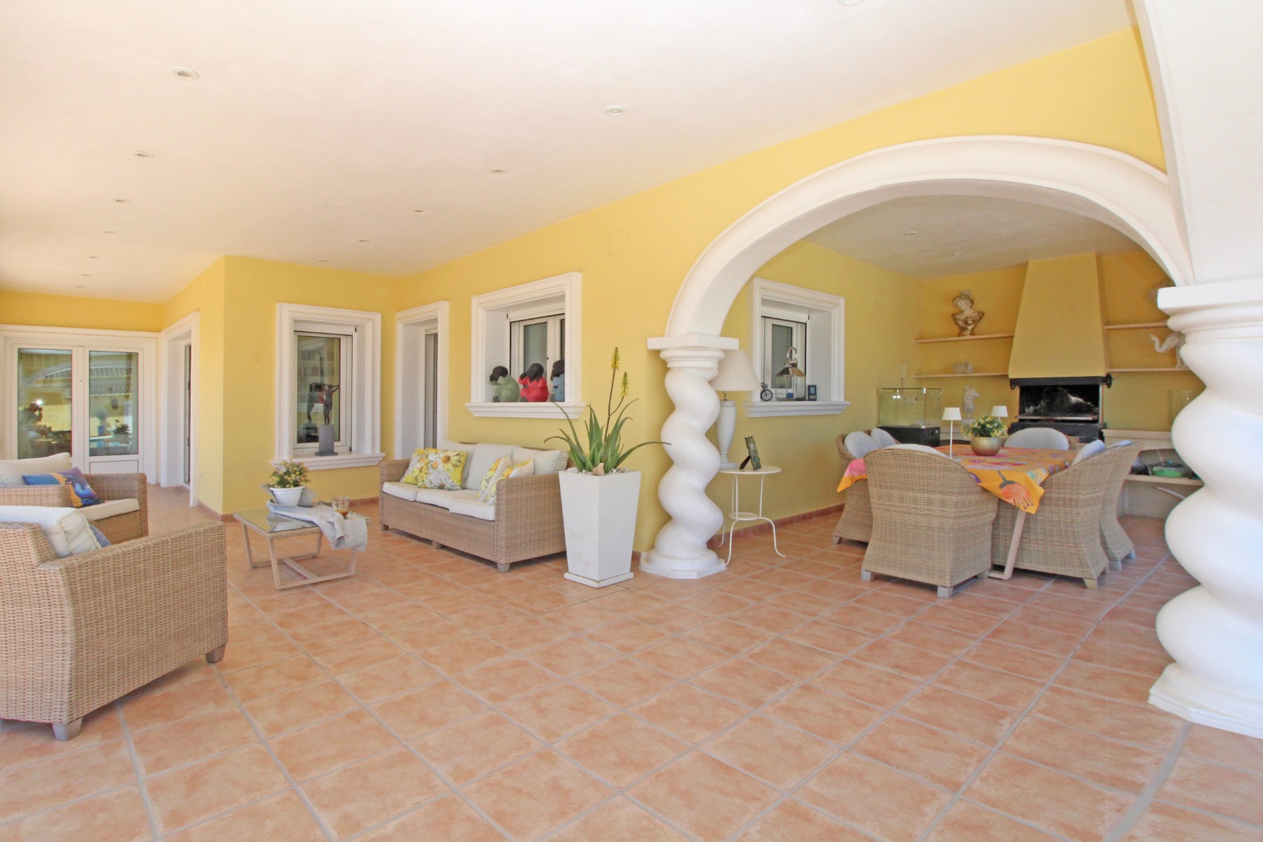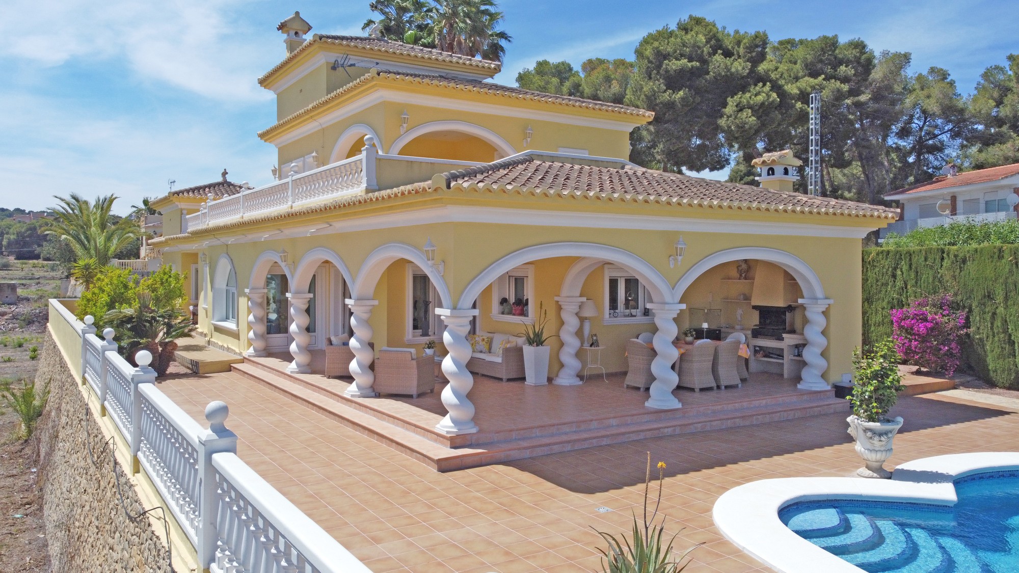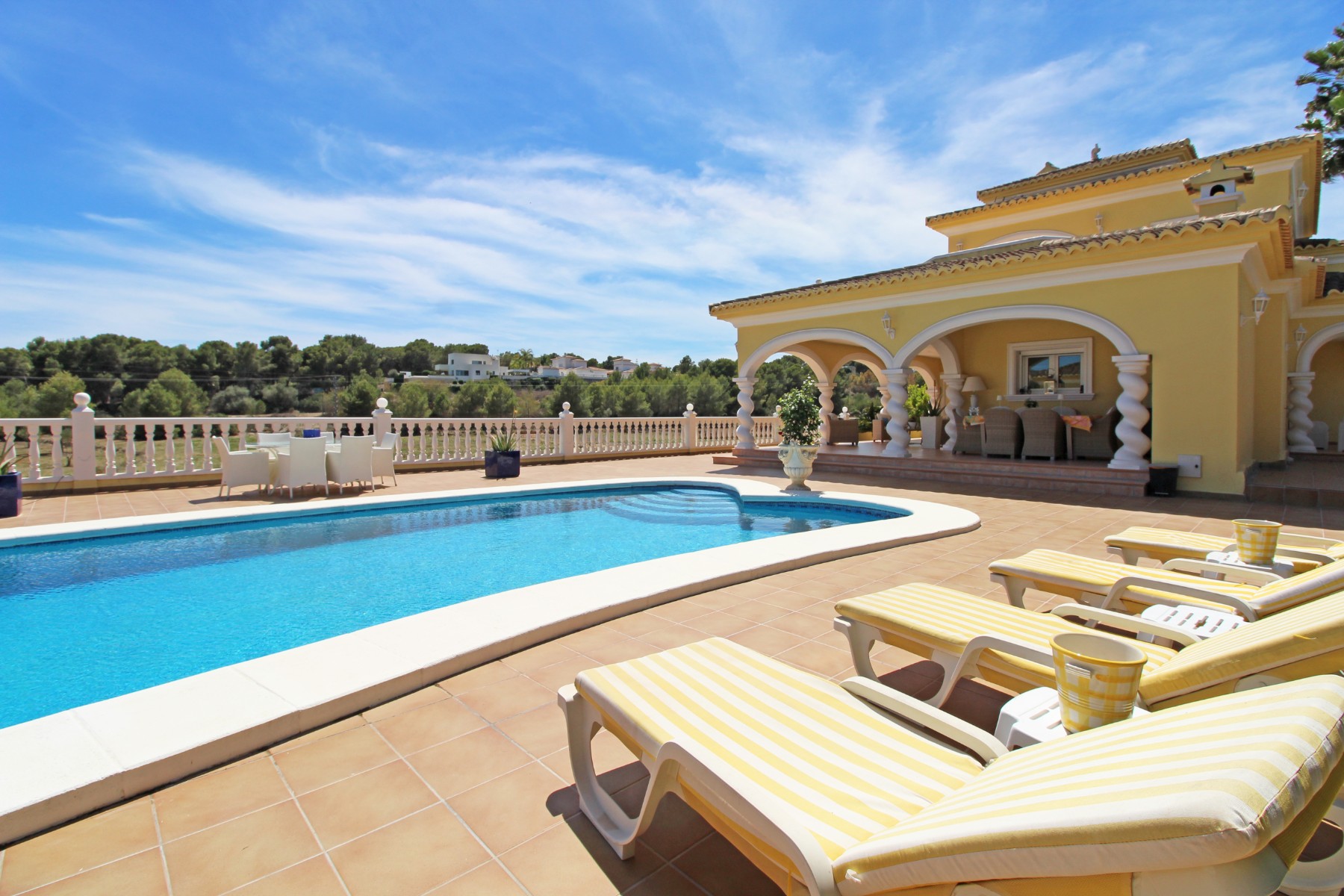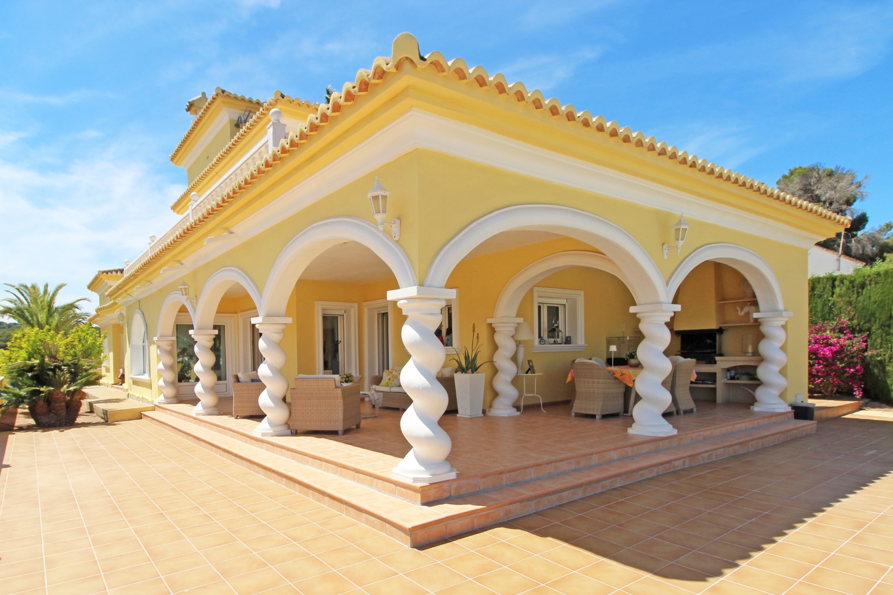 Discover this exceptional villa, ideally located just a 5-minute walk from both the beach and the village in Moraira. Upon entering the beautiful foyer, you will be greeted by an impressive entrance with double doors leading to the spacious living and dining room, adorned with a marble fireplace mantle with a gas fireplace and a custom-made wall unit, offering both comfort and elegance. A sliding door provides access to the covered terrace, seamlessly blending indoor and outdoor living. To the left of the foyer, a hallway leads to the fully equipped kitchen with ceramic hob, fridge-freezer, and dishwasher. From the kitchen, you can access the covered terrace and another terrace. This hallway also houses the utility room with washing machine and a guest toilet. To the right of the foyer, you will find built-in wardrobes, a storage room, a bathroom with bathtub, a spacious guest room with a sitting area and access to a covered terrace, as well as another large bedroom with ample closet space and an en-suite bathroom with bathtub. The impressive marble staircase from the foyer leads to the upper floor where the master bedroom awaits, complete with a walk-in closet and an en-suite bathroom with walk-in shower and bathtub. This bedroom offers access to a large covered and open terrace, ideal for enjoying the views. Step into the luxury lifestyle through the covered terrace on the ground floor, featuring a lounge and barbecue area complete with dining table, all overlooking the expansive 6 x 12m swimming pool. Surrounding the pool is a large south-facing terrace, with plenty of space for multiple sun loungers, ensuring relaxation under the Mediterranean sun. Access to the spacious garage, equipped with an automatic sectional door, is seamlessly facilitated through the automatic entrance gate. Additionally, you can enjoy the convenience of an outdoor shower. There is also a technical room for the pool. This beautiful property is equipped with gas central heating (gas tank), providing year-round comfort, along with air conditioning for added convenience. Take advantage of the benefits of double glazing and automatic shutters in the bedrooms, providing both insulation and security. LED recessed lighting adorns the interior, creating a welcoming atmosphere. Effortlessly control the pedestrian gate, automatic gate, and garage door from the house. Furthermore, you can rest assured knowing that the property is secured with a connected alarm system. To promote both safety and aesthetics, the entire plot is illuminated with outdoor lighting, while the villa is embraced by carefully maintained Mediterranean gardens, adorned with mature trees. Enjoy the beauty of nature and the proximity to the village and beach, making this property a serene oasis in Moraira. Contact us for an exclusive viewing and experience firsthand the unparalleled luxury and tranquility that this property has to offer. We look forward to welcoming you and helping you find your dream home in Moraira.