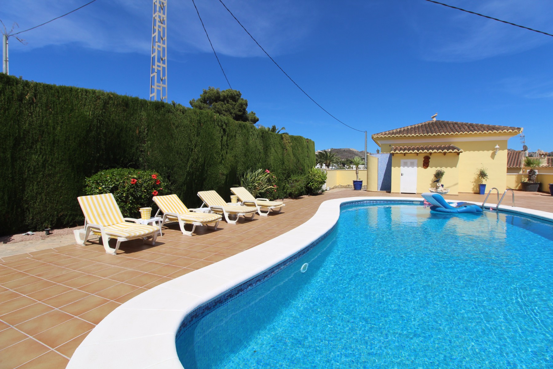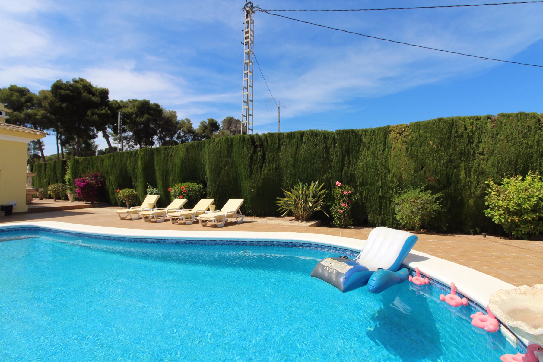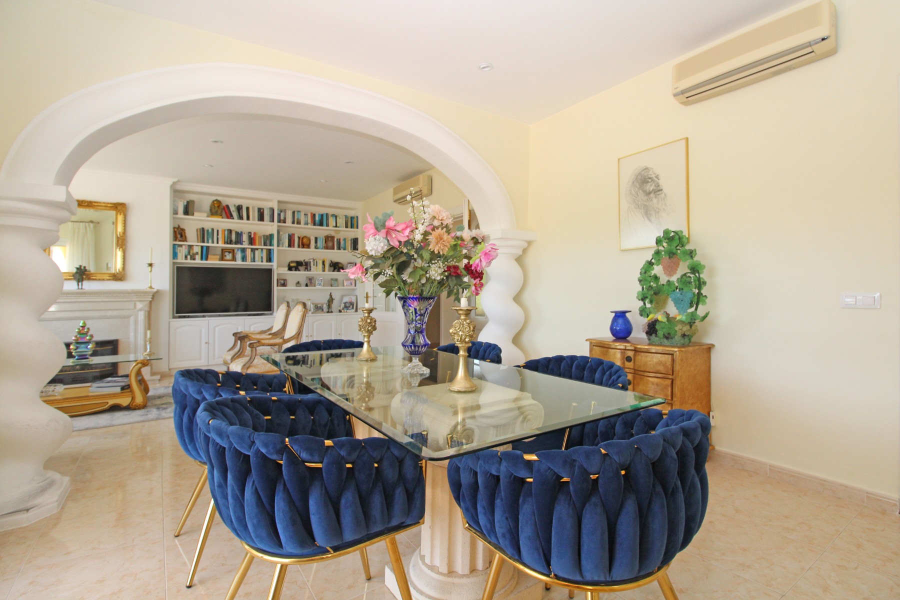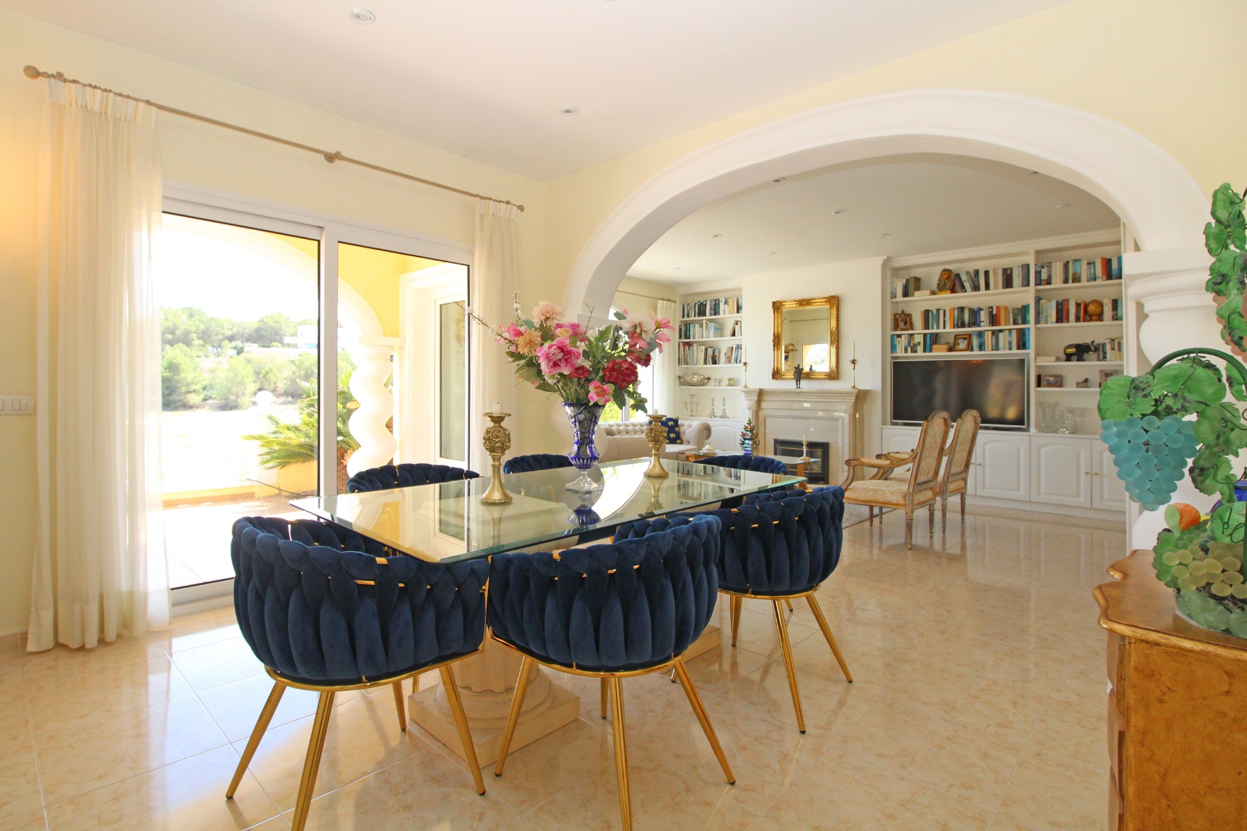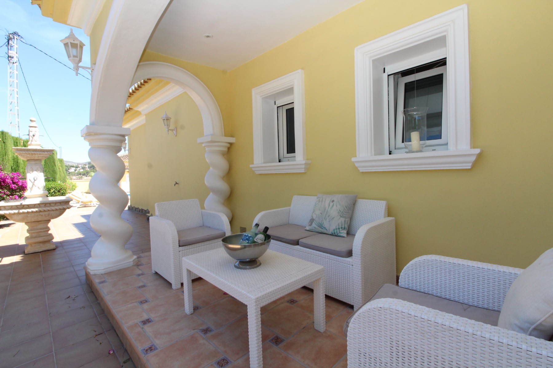 Discover this exceptional villa, ideally located just a 5-minute walk from both the beach and the village in Moraira. Upon entering the beautiful foyer, you will be greeted by an impressive entrance with double doors leading to the spacious living and dining room, adorned with a marble fireplace mantle with a gas fireplace and a custom-made wall unit, offering both comfort and elegance. A sliding door provides access to the covered terrace, seamlessly blending indoor and outdoor living. To the left of the foyer, a hallway leads to the fully equipped kitchen with ceramic hob, fridge-freezer, and dishwasher. From the kitchen, you can access the covered terrace and another terrace. This hallway also houses the utility room with washing machine and a guest toilet. To the right of the foyer, you will find built-in wardrobes, a storage room, a bathroom with bathtub, a spacious guest room with a sitting area and access to a covered terrace, as well as another large bedroom with ample closet space and an en-suite bathroom with bathtub. The impressive marble staircase from the foyer leads to the upper floor where the master bedroom awaits, complete with a walk-in closet and an en-suite bathroom with walk-in shower and bathtub. This bedroom offers access to a large covered and open terrace, ideal for enjoying the views. Step into the luxury lifestyle through the covered terrace on the ground floor, featuring a lounge and barbecue area complete with dining table, all overlooking the expansive 6 x 12m swimming pool. Surrounding the pool is a large south-facing terrace, with plenty of space for multiple sun loungers, ensuring relaxation under the Mediterranean sun. Access to the spacious garage, equipped with an automatic sectional door, is seamlessly facilitated through the automatic entrance gate. Additionally, you can enjoy the convenience of an outdoor shower. There is also a technical room for the pool. This beautiful property is equipped with gas central heating (gas tank), providing year-round comfort, along with air conditioning for added convenience. Take advantage of the benefits of double glazing and automatic shutters in the bedrooms, providing both insulation and security. LED recessed lighting adorns the interior, creating a welcoming atmosphere. Effortlessly control the pedestrian gate, automatic gate, and garage door from the house. Furthermore, you can rest assured knowing that the property is secured with a connected alarm system. To promote both safety and aesthetics, the entire plot is illuminated with outdoor lighting, while the villa is embraced by carefully maintained Mediterranean gardens, adorned with mature trees. Enjoy the beauty of nature and the proximity to the village and beach, making this property a serene oasis in Moraira. Contact us for an exclusive viewing and experience firsthand the unparalleled luxury and tranquility that this property has to offer. We look forward to welcoming you and helping you find your dream home in Moraira.
