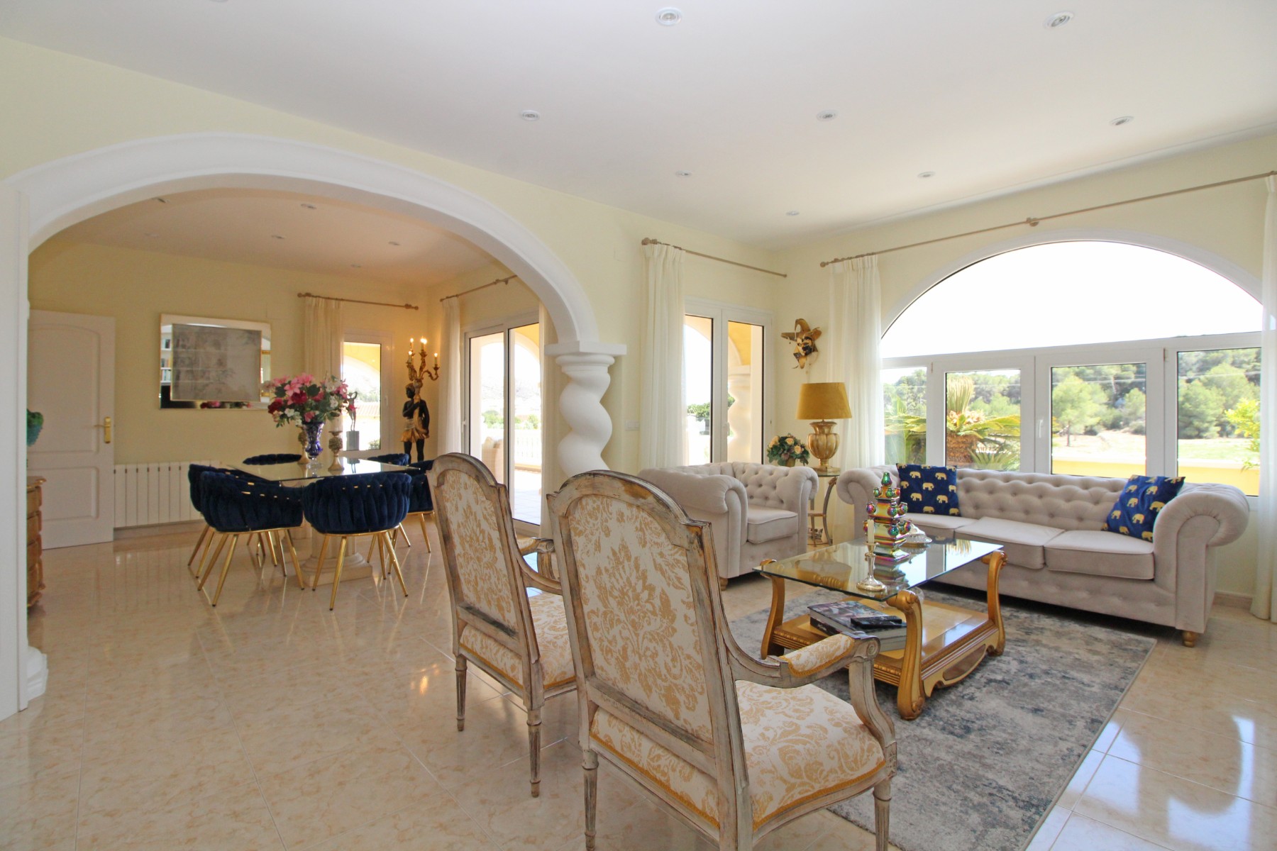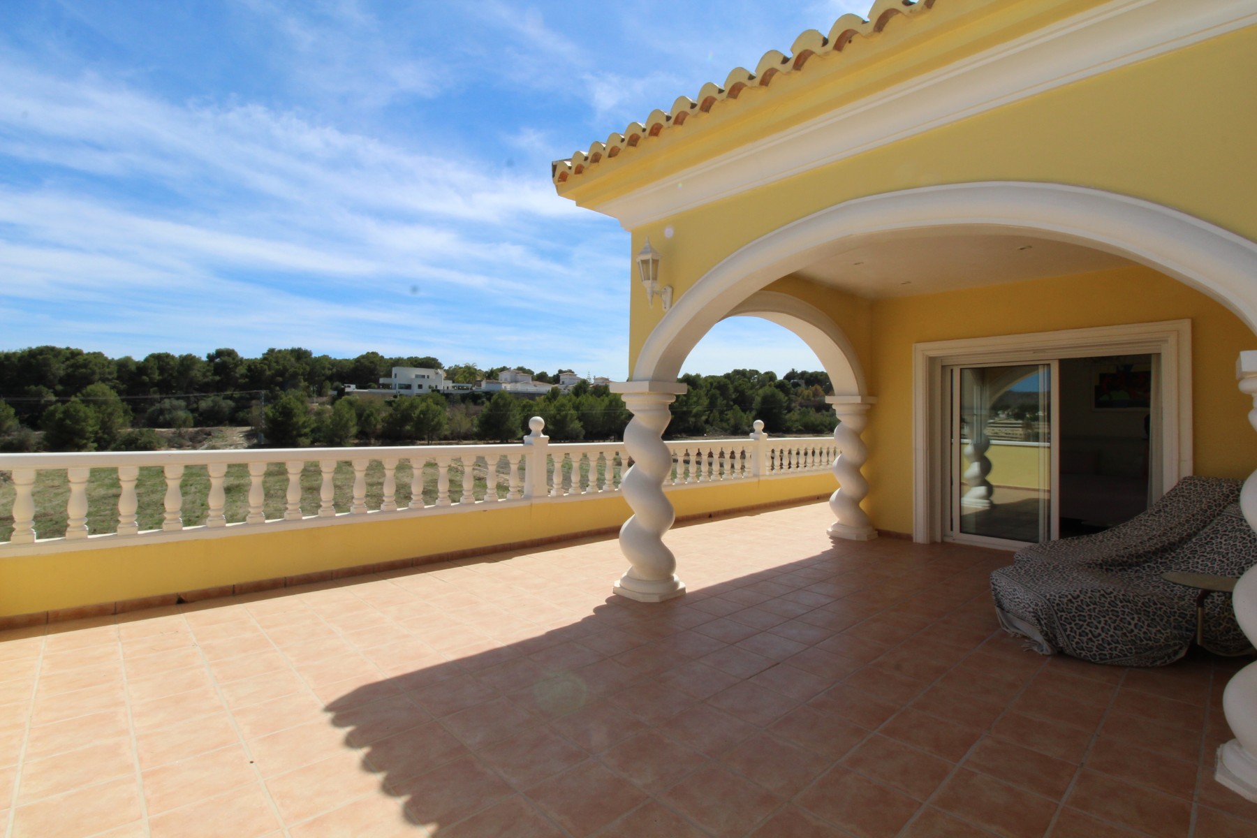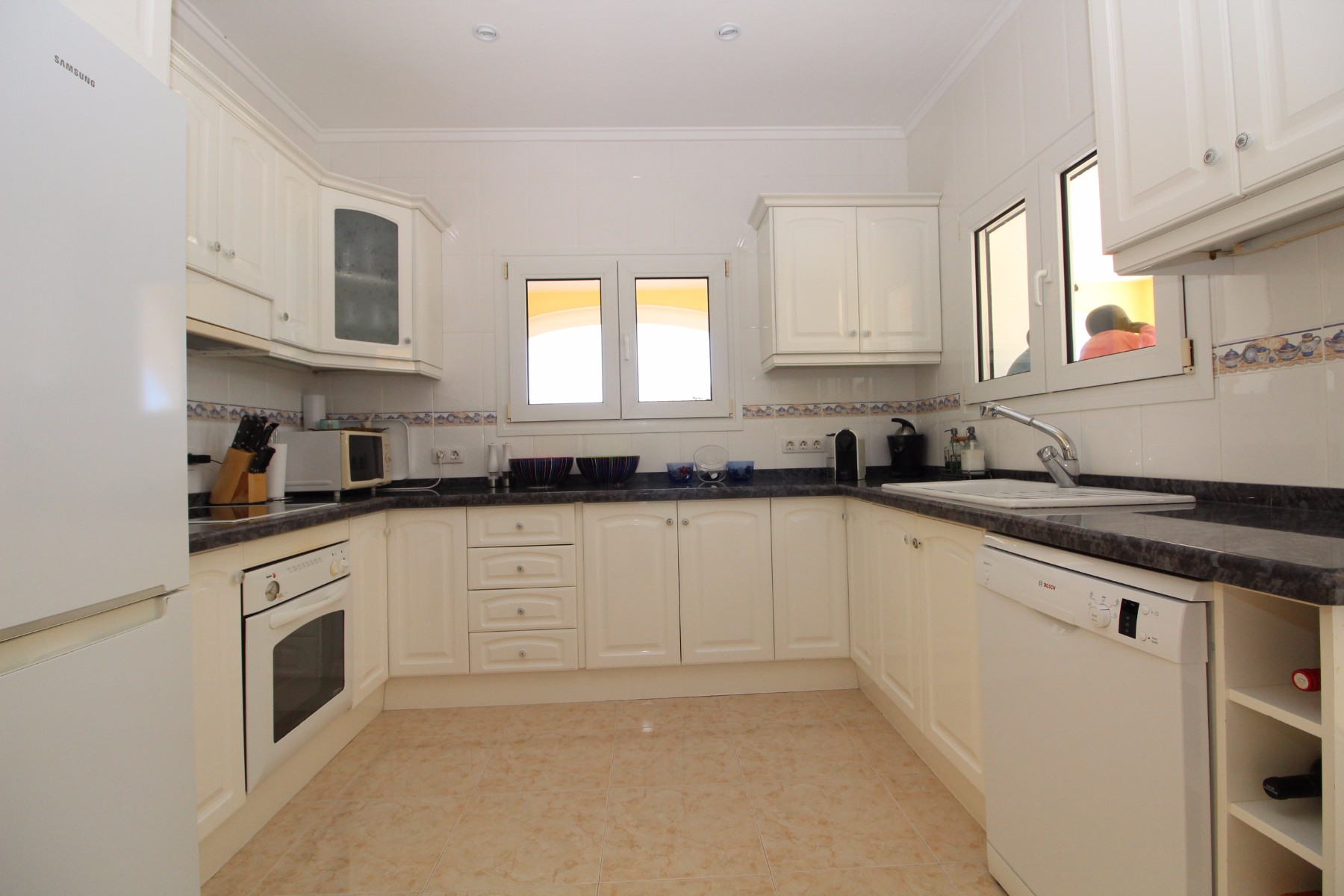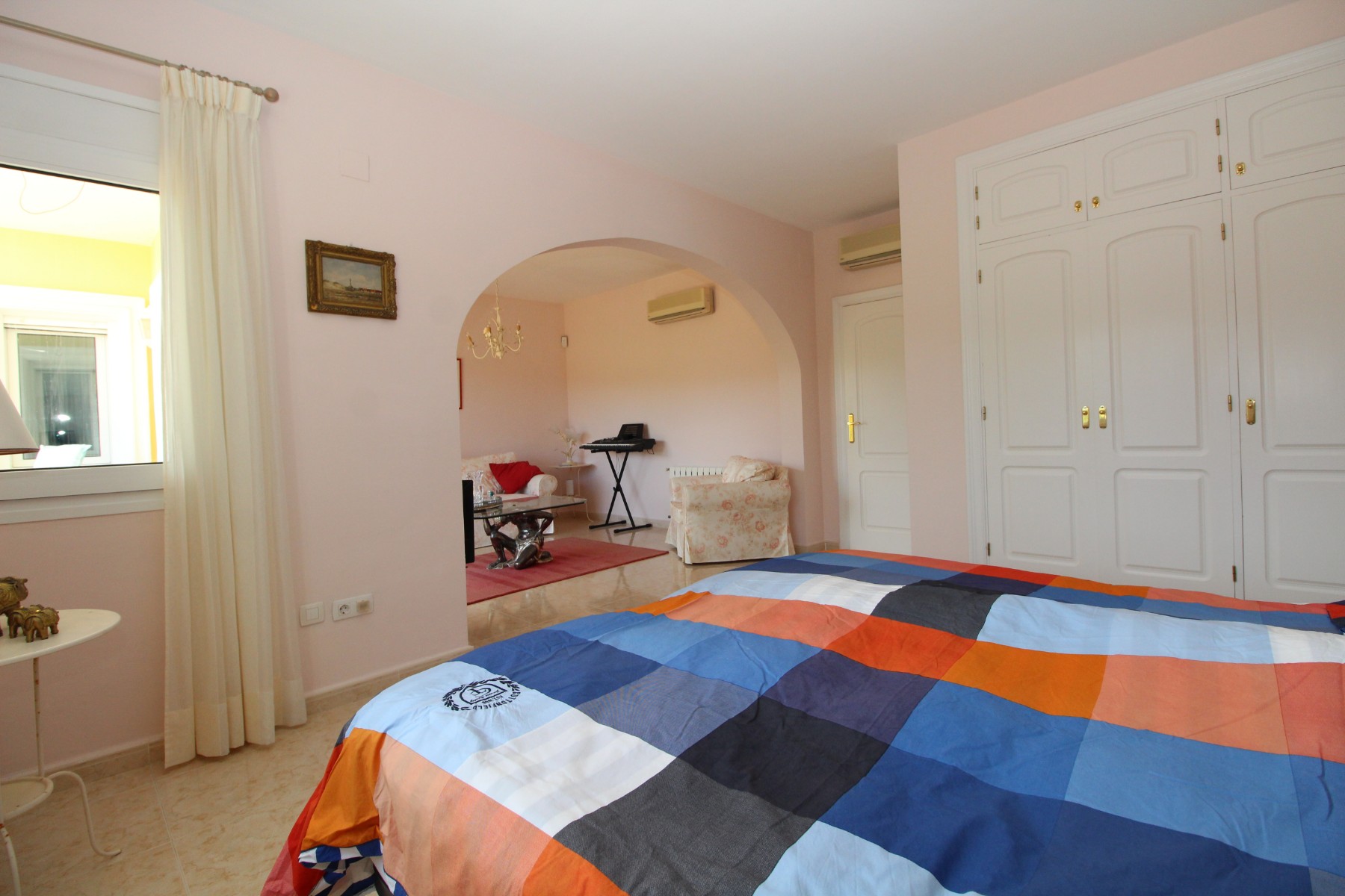 Discover this exceptional villa, ideally located just a 5-minute walk from both the beach and the village in Moraira. Upon entering the beautiful foyer, you will be greeted by an impressive entrance with double doors leading to the spacious living and dining room, adorned with a marble fireplace mantle with a gas fireplace and a custom-made wall unit, offering both comfort and elegance. A sliding door provides access to the covered terrace, seamlessly blending indoor and outdoor living. To the left of the foyer, a hallway leads to the fully equipped kitchen with ceramic hob, fridge-freezer, and dishwasher. From the kitchen, you can access the covered terrace and another terrace. This hallway also houses the utility room with washing machine and a guest toilet. To the right of the foyer, you will find built-in wardrobes, a storage room, a bathroom with bathtub, a spacious guest room with a sitting area and access to a covered terrace, as well as another large bedroom with ample closet space and an en-suite bathroom with bathtub. The impressive marble staircase from the foyer leads to the upper floor where the master bedroom awaits, complete with a walk-in closet and an en-suite bathroom with walk-in shower and bathtub. This bedroom offers access to a large covered and open terrace, ideal for enjoying the views. Step into the luxury lifestyle through the covered terrace on the ground floor, featuring a lounge and barbecue area complete with dining table, all overlooking the expansive 6 x 12m swimming pool. Surrounding the pool is a large south-facing terrace, with plenty of space for multiple sun loungers, ensuring relaxation under the Mediterranean sun. Access to the spacious garage, equipped with an automatic sectional door, is seamlessly facilitated through the automatic entrance gate. Additionally, you can enjoy the convenience of an outdoor shower. There is also a technical room for the pool. This beautiful property is equipped with gas central heating (gas tank), providing year-round comfort, along with air conditioning for added convenience. Take advantage of the benefits of double glazing and automatic shutters in the bedrooms, providing both insulation and security. LED recessed lighting adorns the interior, creating a welcoming atmosphere. Effortlessly control the pedestrian gate, automatic gate, and garage door from the house. Furthermore, you can rest assured knowing that the property is secured with a connected alarm system. To promote both safety and aesthetics, the entire plot is illuminated with outdoor lighting, while the villa is embraced by carefully maintained Mediterranean gardens, adorned with mature trees. Enjoy the beauty of nature and the proximity to the village and beach, making this property a serene oasis in Moraira. Contact us for an exclusive viewing and experience firsthand the unparalleled luxury and tranquility that this property has to offer. We look forward to welcoming you and helping you find your dream home in Moraira.