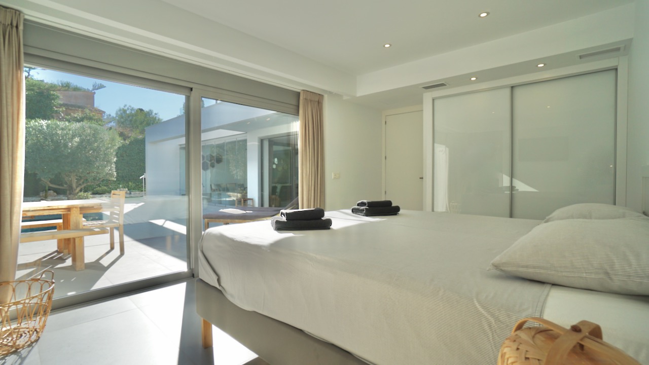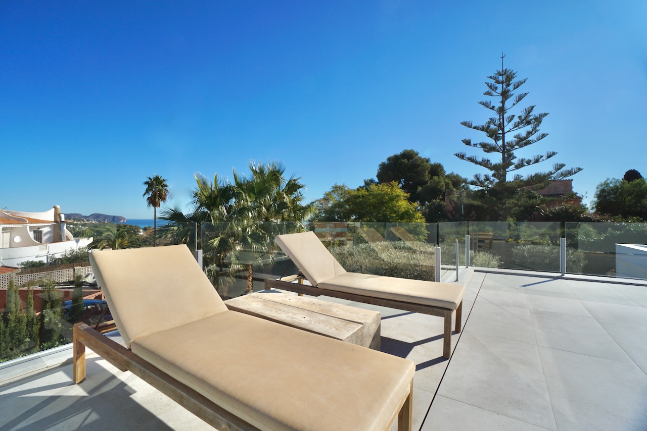 We would like to present you this fantastic modern villa located in the quiet, sought-after area of La Fustera, Benissa. At only 15 minutes' walk you can easily reach the sandy beach, supermarket and restaurants! Be immersed in an oasis of calm combined with sleek design and sea views. You can reach the 2019-built villa either via the electric gate or via the pedestrian door. There is ample parking for at least 2 cars as well as an indoor garage with direct access to the property. If one chooses to enter the property via the front door, one enters the hugely light-filled open-plan living-dining room with beautiful views over the mature gardens and the 9.5m x 4.5m pool with electrical pool cover, that functions as natural sun pool heating, as well as the beautiful pool terrace that surrounds the pool. Annex to this room you will also find a cosy winter garden glazed in with accordion glass, which can be slid open in summer for an open covered terrace and closed in the colder, cosier days. Furthermore, the kitchen with cooking island is fully equipped with all the best quality appliances and next to the kitchen there is a separate, practical laundry room. Finally, on this living level we also find 2 super spacious bedrooms with fitted wardrobes and a very spacious bathroom to share. Through the living room with large sliding windows or through the second guest room, we can directly enjoy the terrace, the garden and the magnificent swimming pool. There is also a technical room with enough space to store a few belongings. An internal or external staircase leads us to the first floor of this unique villa! Here we find 2 very big bedrooms with fitted wardrobes and ensuite bathrooms, both of which also have access to the spacious terrace with beautiful sea views. Here you can enjoy the sun all day long. As icing on the cake, the house has centralised air conditioning with separate control for each room. As well as 14 solar panels and a heated pool with electric cover. There is also an alarm with cameras and LED interior and exterior lighting. Finally, the villa has a tourist licence and a very strong, proven rental income that can be to the new owners.