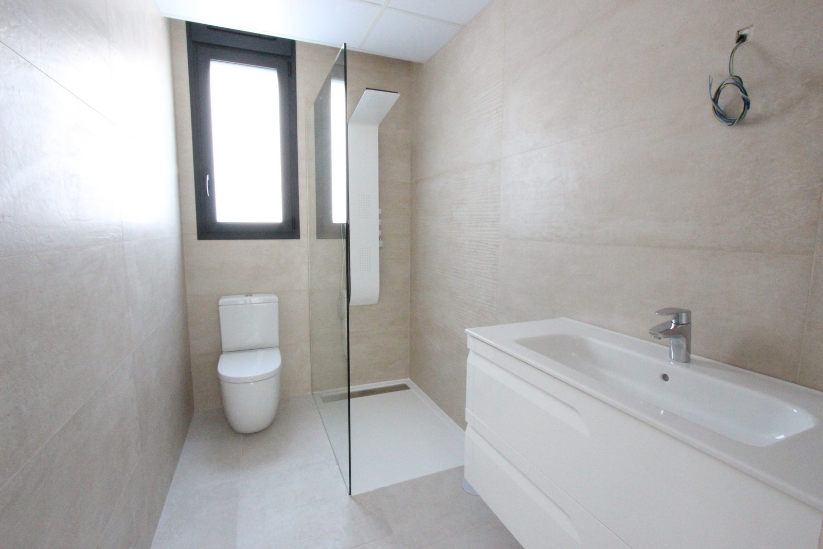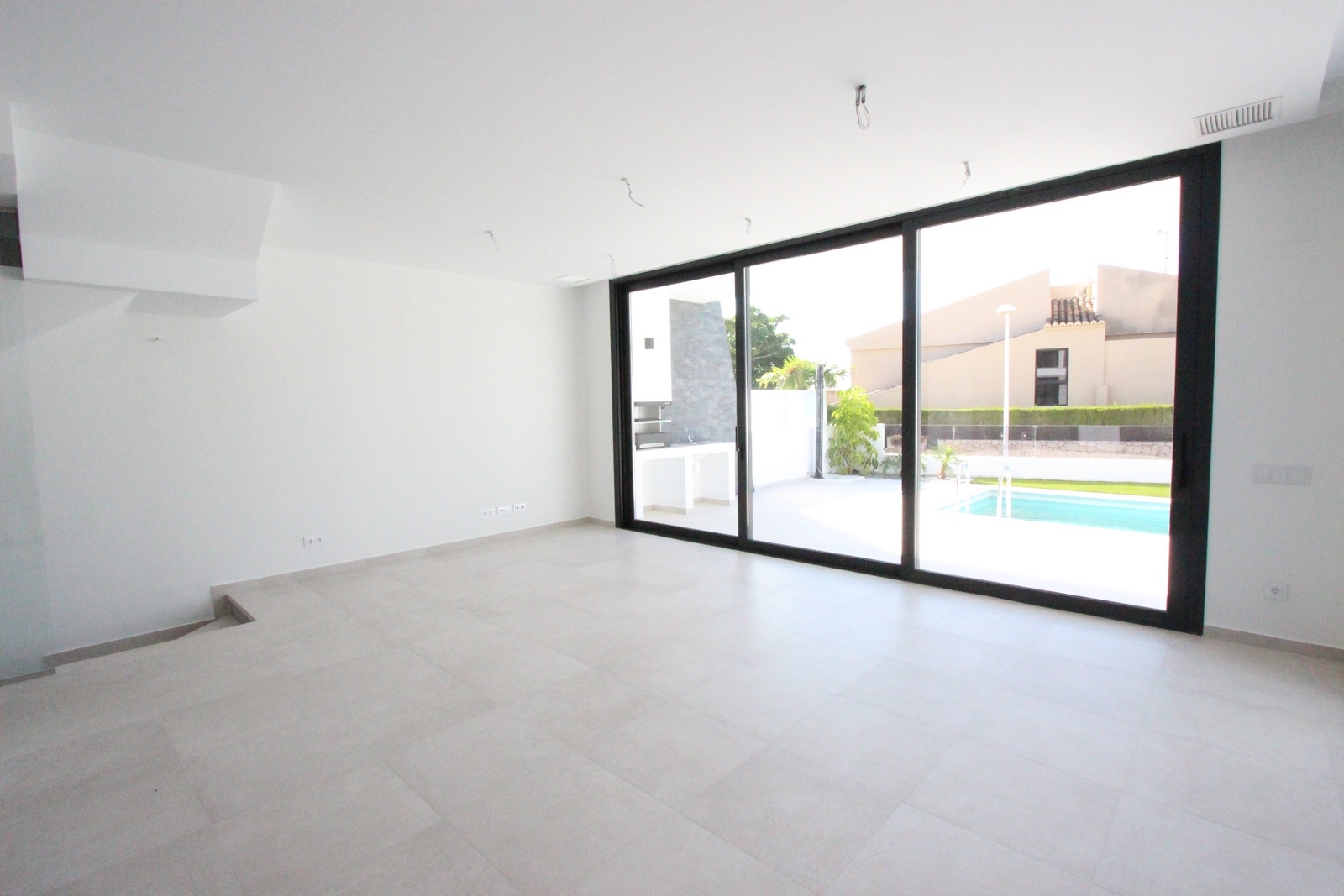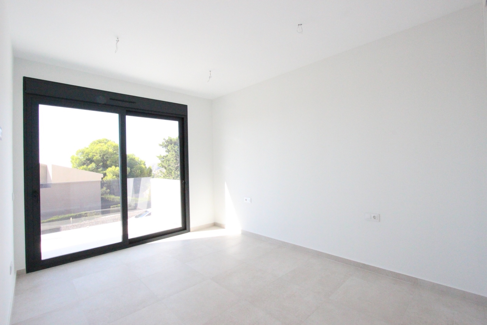 Modern semi-detached villa for sale in Calpe. This complex comprises ten semi-detached villas with 3 floors. Alle benefitting from sea views. The lovely beach of Arenal Bol is less than a kilometer away. The villas have a private pool. Apart from that there is a community and children's pool on the complex. There is a barbecue zone and various green areas.  This model has 3 bedrooms. We enter the villa on the main floor where we find an open plan living-dining-kitchen area. From this area you have direct access to the porch, pool terrace and garden. The kitchen comes fully equipped. Also guest toilet and laundry on this floor. Steps lead up to the top floor, where there are 3 bedrooms and 2 bathrooms. The basement houses the 2 car garage, storage room and bathroom. The villa is very comfortable: underfloor heating, aircon, intelligent home system, double glazing, pre installation of fiber net throughout and video-intercom.