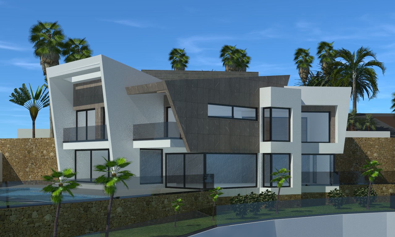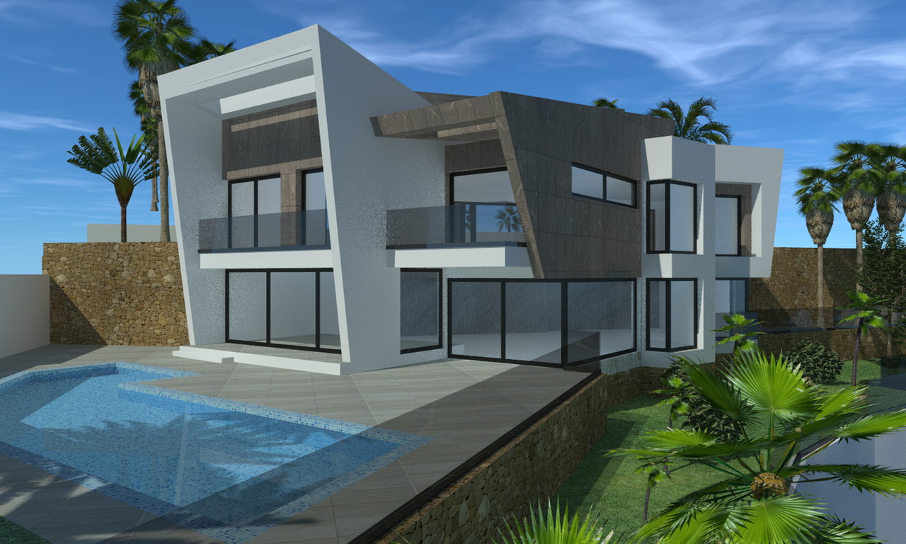 4 modern new build villas with views of the Peñon, the bay and Puerto Blanco for sale in Calpe.  The 4 villas have approximately the same built surface and the same layout, more information about the 4 villas separately can be provided on request. In the images you will find the building plans and surfaces of 1 villa.  On the ground floor there is a spacious living room with a fully equipped open kitchen from which you can go to the terrace. There is also a hall with a lift, a staircase and a guest toilet, furthermore a double bedroom with dressing room and en-suite bathroom.  On the first floor there is a spacious master bedroom with dressing room, an en-suite bathroom and a private terrace, in addition there are 2 more double bedrooms with both en-suite bathrooms that share a terrace. There is also a double garage on this level.  Outside in the low maintenance garden there is a spacious terrace, a large infinity pool with pool shower and natural stone walls have been used to cover the different levels.