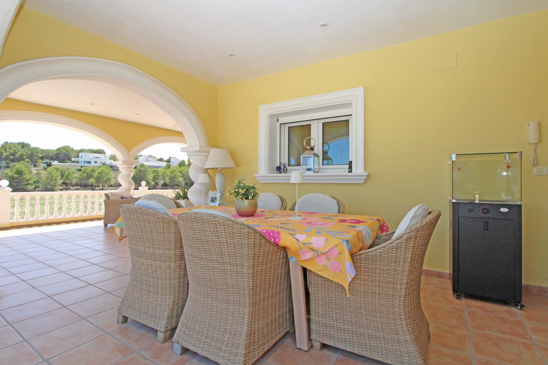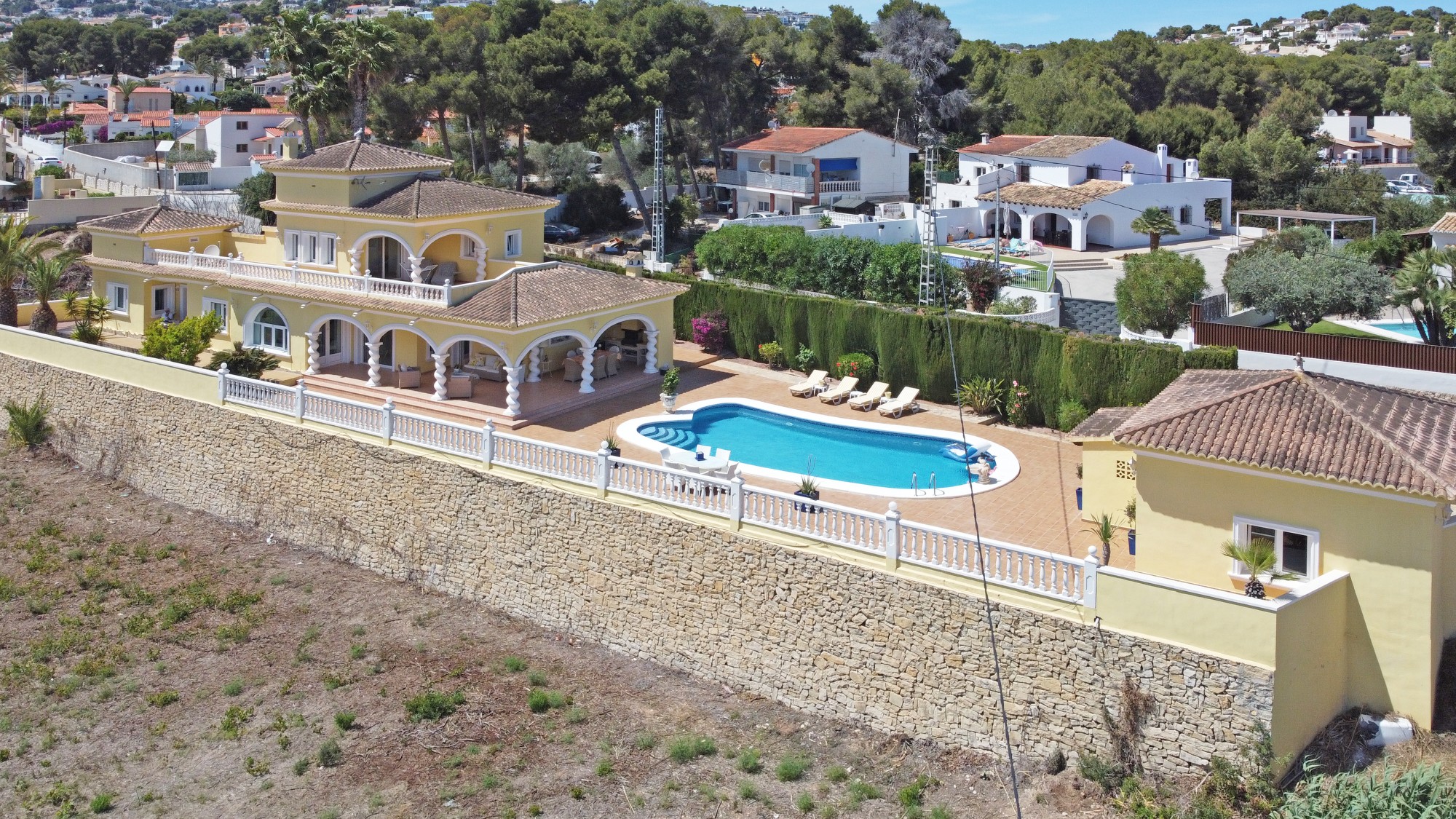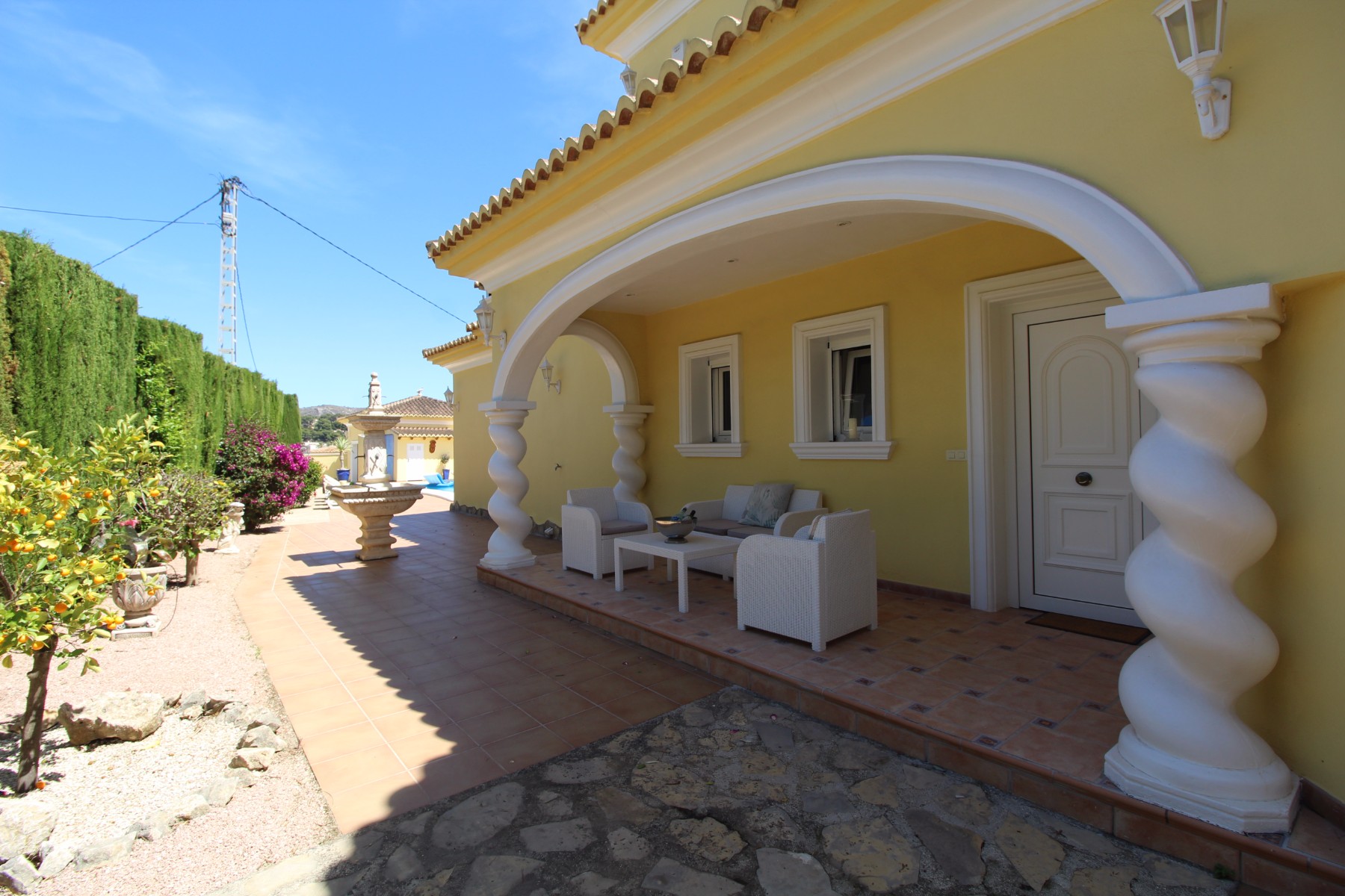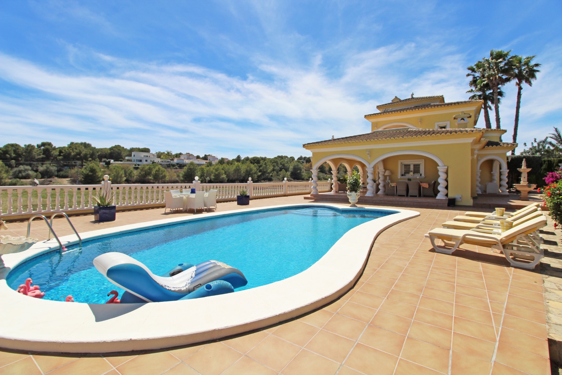 Discover this exceptional villa, ideally located just a 5-minute walk from both the beach and the village in Moraira. Upon entering the beautiful foyer, you will be greeted by an impressive entrance with double doors leading to the spacious living and dining room, adorned with a marble fireplace mantle with a gas fireplace and a custom-made wall unit, offering both comfort and elegance. A sliding door provides access to the covered terrace, seamlessly blending indoor and outdoor living. To the left of the foyer, a hallway leads to the fully equipped kitchen with ceramic hob, fridge-freezer, and dishwasher. From the kitchen, you can access the covered terrace and another terrace. This hallway also houses the utility room with washing machine and a guest toilet. To the right of the foyer, you will find built-in wardrobes, a storage room, a bathroom with bathtub, a spacious guest room with a sitting area and access to a covered terrace, as well as another large bedroom with ample closet space and an en-suite bathroom with bathtub. The impressive marble staircase from the foyer leads to the upper floor where the master bedroom awaits, complete with a walk-in closet and an en-suite bathroom with walk-in shower and bathtub. This bedroom offers access to a large covered and open terrace, ideal for enjoying the views. Step into the luxury lifestyle through the covered terrace on the ground floor, featuring a lounge and barbecue area complete with dining table, all overlooking the expansive 6 x 12m swimming pool. Surrounding the pool is a large south-facing terrace, with plenty of space for multiple sun loungers, ensuring relaxation under the Mediterranean sun. Access to the spacious garage, equipped with an automatic sectional door, is seamlessly facilitated through the automatic entrance gate. Additionally, you can enjoy the convenience of an outdoor shower. There is also a technical room for the pool. This beautiful property is equipped with gas central heating (gas tank), providing year-round comfort, along with air conditioning for added convenience. Take advantage of the benefits of double glazing and automatic shutters in the bedrooms, providing both insulation and security. LED recessed lighting adorns the interior, creating a welcoming atmosphere. Effortlessly control the pedestrian gate, automatic gate, and garage door from the house. Furthermore, you can rest assured knowing that the property is secured with a connected alarm system. To promote both safety and aesthetics, the entire plot is illuminated with outdoor lighting, while the villa is embraced by carefully maintained Mediterranean gardens, adorned with mature trees. Enjoy the beauty of nature and the proximity to the village and beach, making this property a serene oasis in Moraira. Contact us for an exclusive viewing and experience firsthand the unparalleled luxury and tranquility that this property has to offer. We look forward to welcoming you and helping you find your dream home in Moraira.