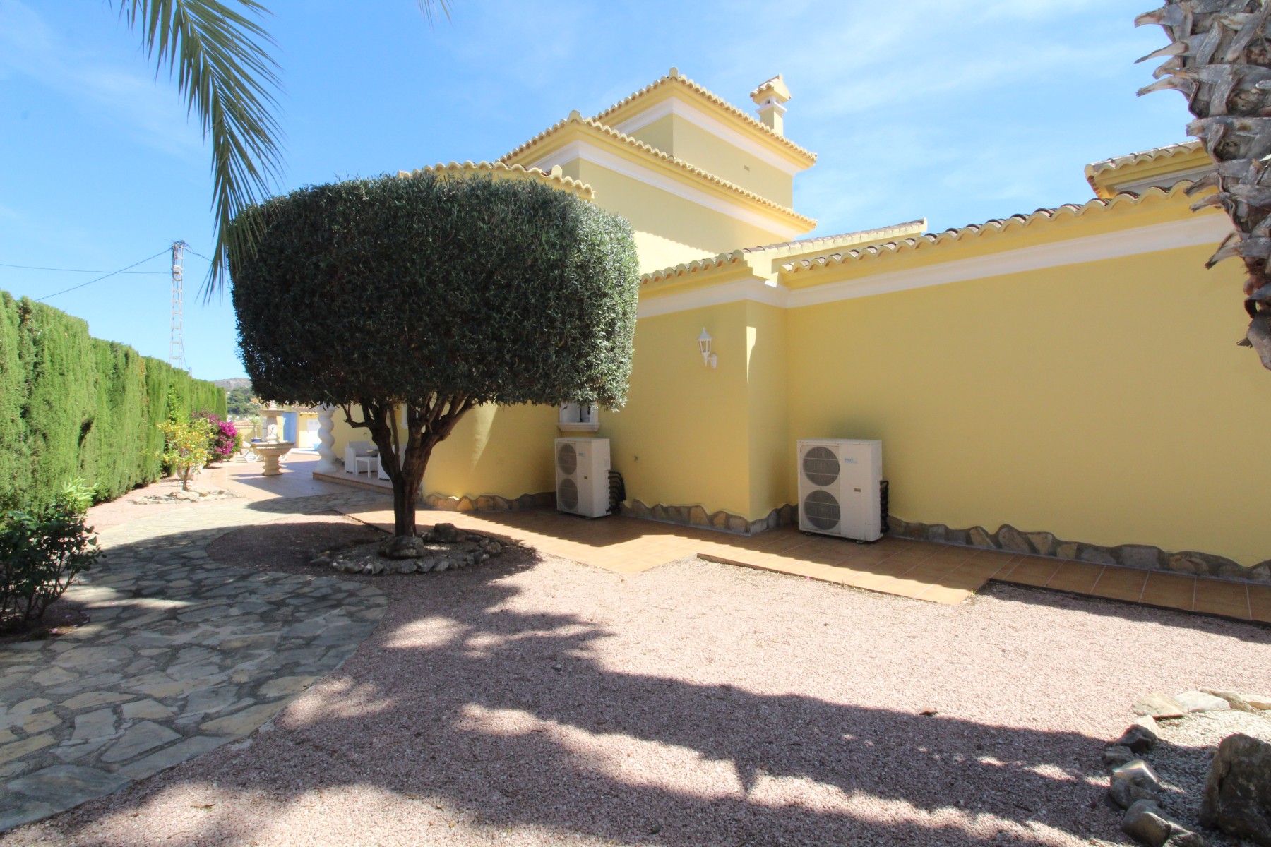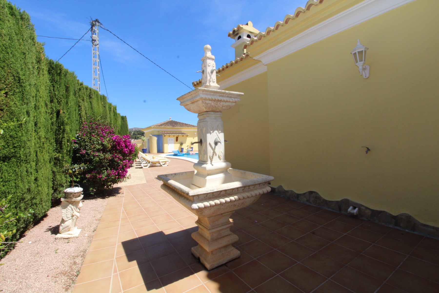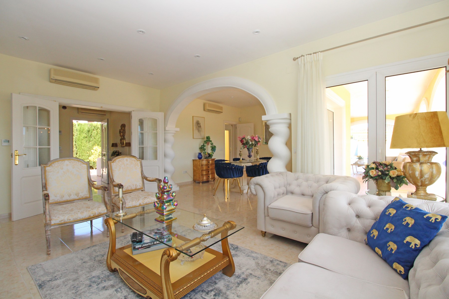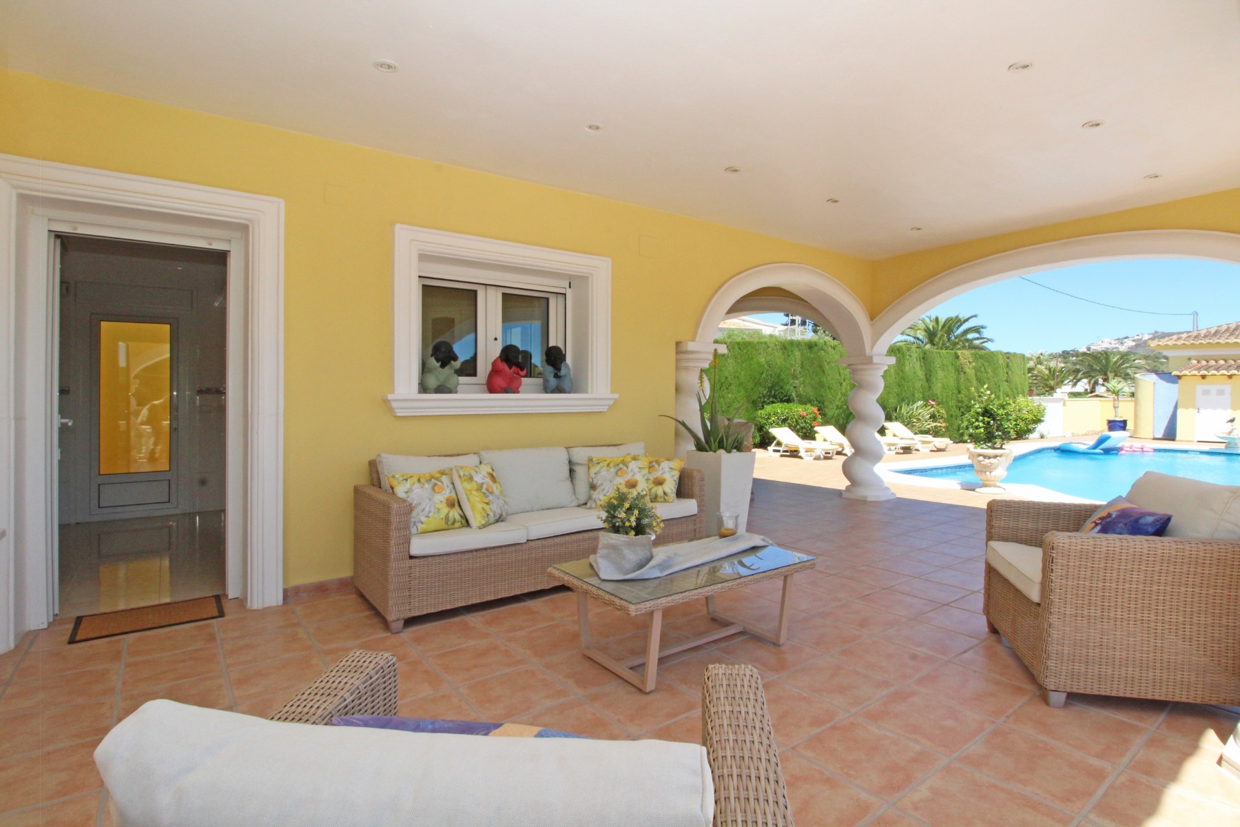 Discover this exceptional villa, ideally located just a 5-minute walk from both the beach and the village in Moraira. Upon entering the beautiful foyer, you will be greeted by an impressive entrance with double doors leading to the spacious living and dining room, adorned with a marble fireplace mantle with a gas fireplace and a custom-made wall unit, offering both comfort and elegance. A sliding door provides access to the covered terrace, seamlessly blending indoor and outdoor living. To the left of the foyer, a hallway leads to the fully equipped kitchen with ceramic hob, fridge-freezer, and dishwasher. From the kitchen, you can access the covered terrace and another terrace. This hallway also houses the utility room with washing machine and a guest toilet. To the right of the foyer, you will find built-in wardrobes, a storage room, a bathroom with bathtub, a spacious guest room with a sitting area and access to a covered terrace, as well as another large bedroom with ample closet space and an en-suite bathroom with bathtub. The impressive marble staircase from the foyer leads to the upper floor where the master bedroom awaits, complete with a walk-in closet and an en-suite bathroom with walk-in shower and bathtub. This bedroom offers access to a large covered and open terrace, ideal for enjoying the views. Step into the luxury lifestyle through the covered terrace on the ground floor, featuring a lounge and barbecue area complete with dining table, all overlooking the expansive 6 x 12m swimming pool. Surrounding the pool is a large south-facing terrace, with plenty of space for multiple sun loungers, ensuring relaxation under the Mediterranean sun. Access to the spacious garage, equipped with an automatic sectional door, is seamlessly facilitated through the automatic entrance gate. Additionally, you can enjoy the convenience of an outdoor shower. There is also a technical room for the pool. This beautiful property is equipped with gas central heating (gas tank), providing year-round comfort, along with air conditioning for added convenience. Take advantage of the benefits of double glazing and automatic shutters in the bedrooms, providing both insulation and security. LED recessed lighting adorns the interior, creating a welcoming atmosphere. Effortlessly control the pedestrian gate, automatic gate, and garage door from the house. Furthermore, you can rest assured knowing that the property is secured with a connected alarm system. To promote both safety and aesthetics, the entire plot is illuminated with outdoor lighting, while the villa is embraced by carefully maintained Mediterranean gardens, adorned with mature trees. Enjoy the beauty of nature and the proximity to the village and beach, making this property a serene oasis in Moraira. Contact us for an exclusive viewing and experience firsthand the unparalleled luxury and tranquility that this property has to offer. We look forward to welcoming you and helping you find your dream home in Moraira.