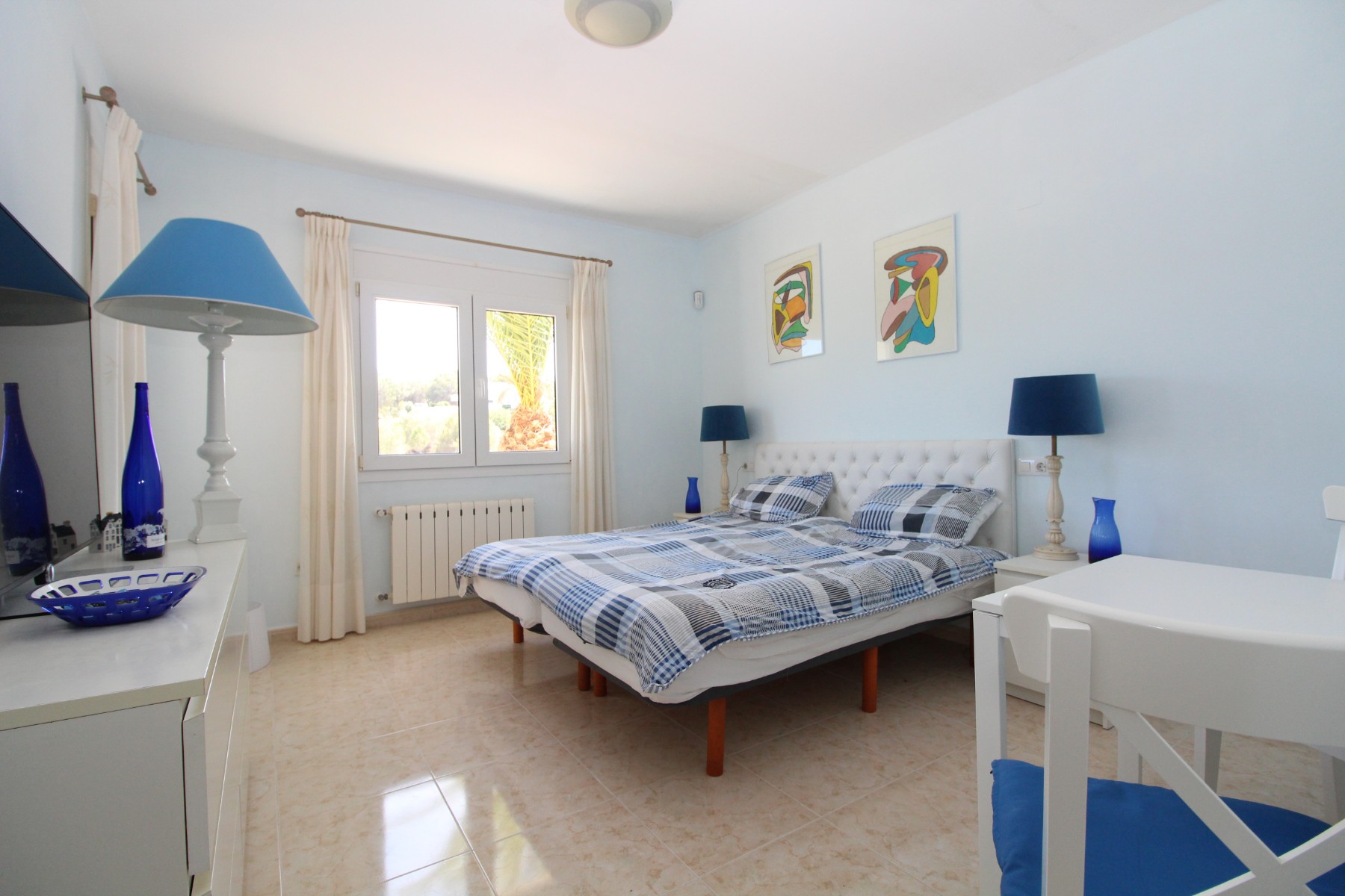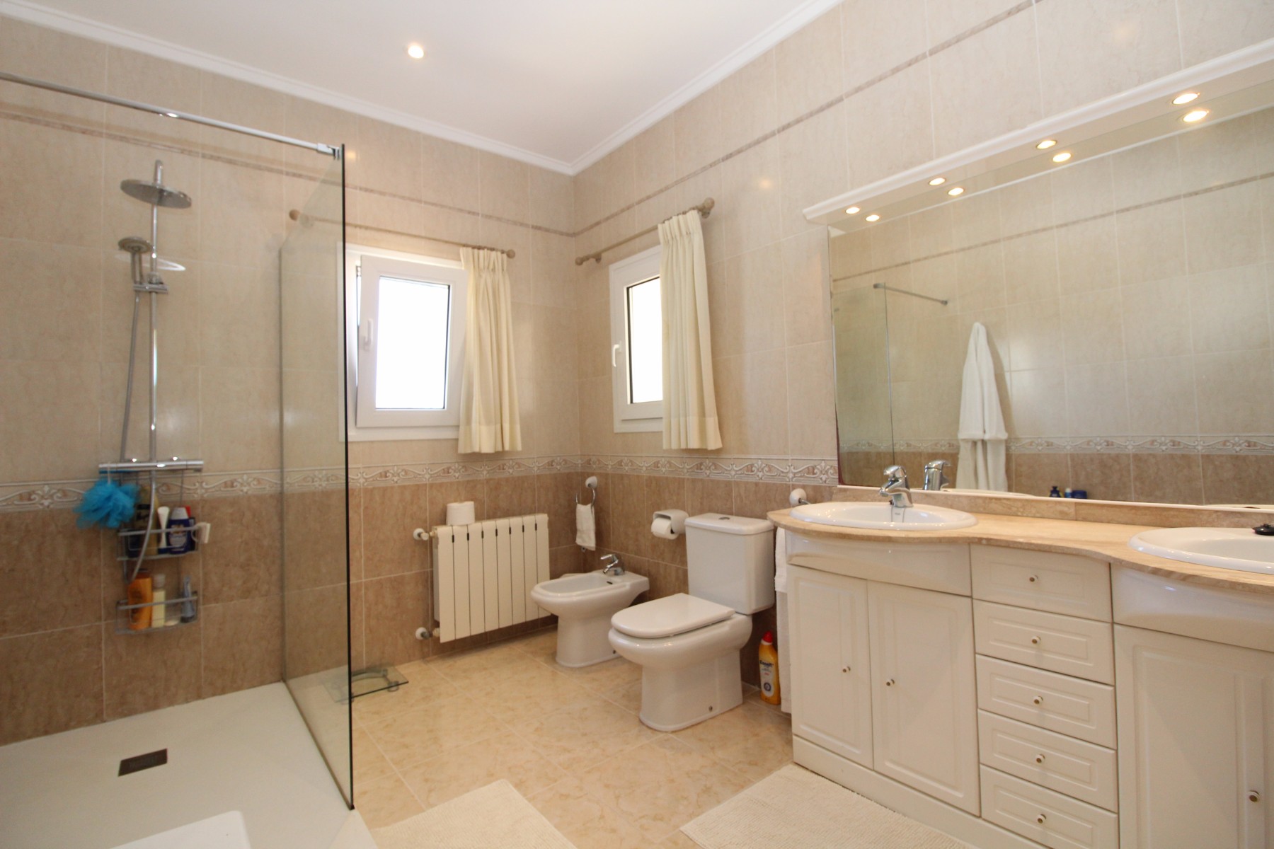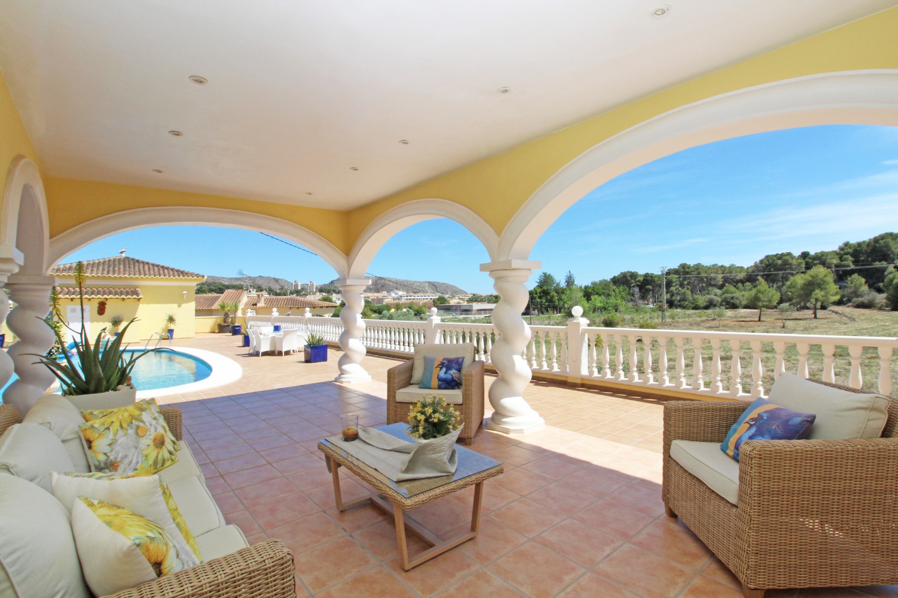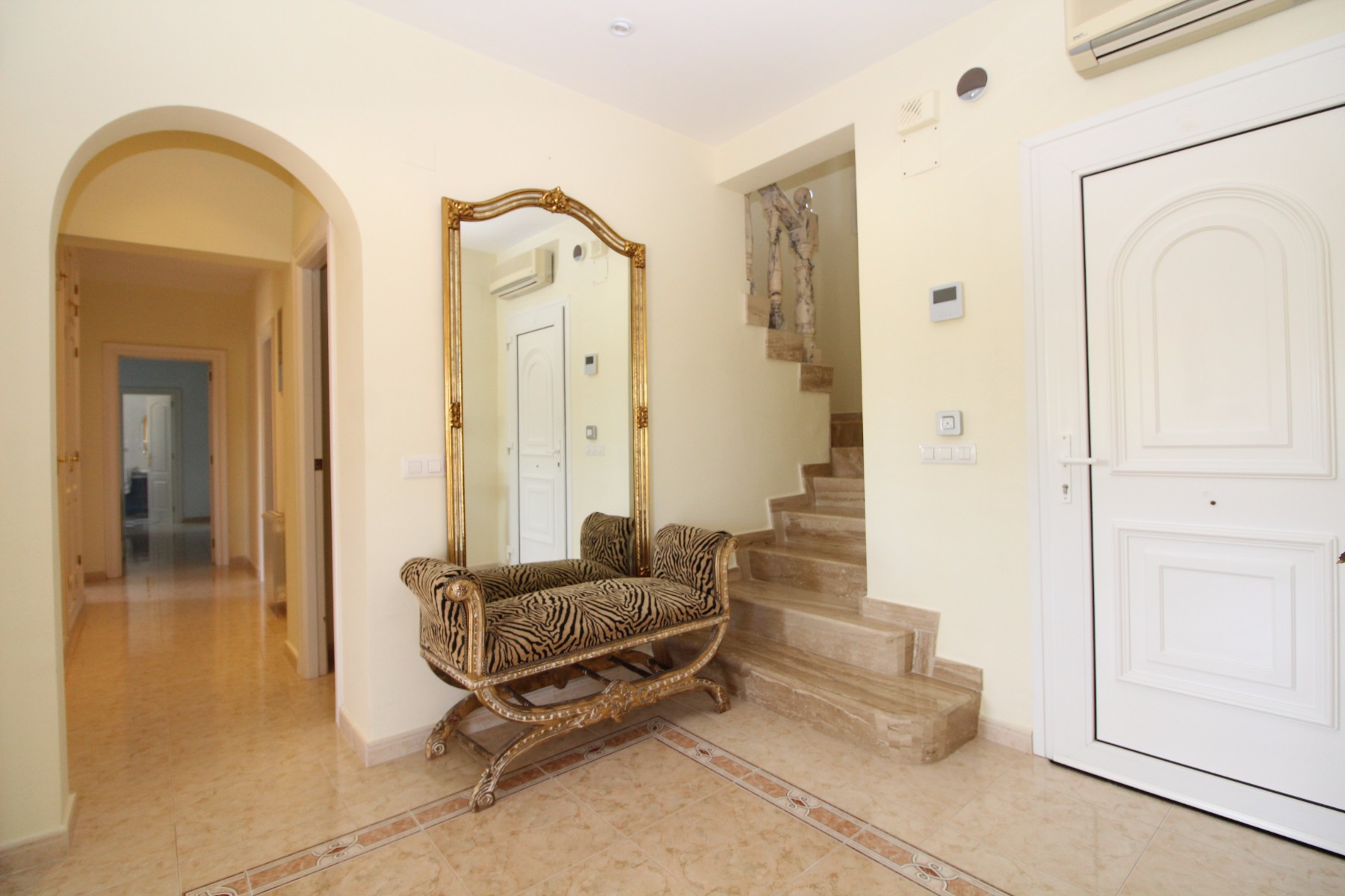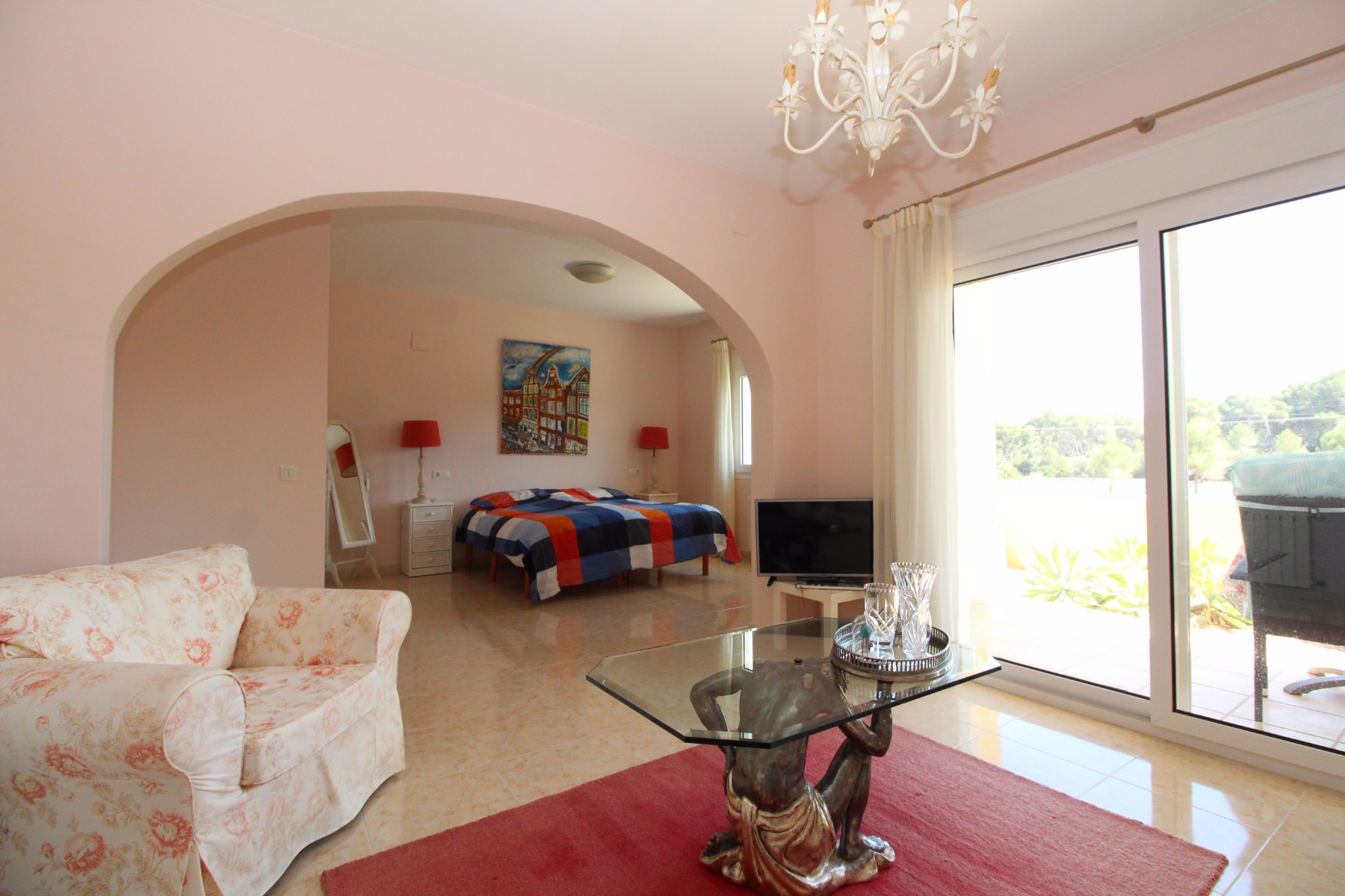 Discover this exceptional villa, ideally located just a 5-minute walk from both the beach and the village in Moraira. Upon entering the beautiful foyer, you will be greeted by an impressive entrance with double doors leading to the spacious living and dining room, adorned with a marble fireplace mantle with a gas fireplace and a custom-made wall unit, offering both comfort and elegance. A sliding door provides access to the covered terrace, seamlessly blending indoor and outdoor living. To the left of the foyer, a hallway leads to the fully equipped kitchen with ceramic hob, fridge-freezer, and dishwasher. From the kitchen, you can access the covered terrace and another terrace. This hallway also houses the utility room with washing machine and a guest toilet. To the right of the foyer, you will find built-in wardrobes, a storage room, a bathroom with bathtub, a spacious guest room with a sitting area and access to a covered terrace, as well as another large bedroom with ample closet space and an en-suite bathroom with bathtub. The impressive marble staircase from the foyer leads to the upper floor where the master bedroom awaits, complete with a walk-in closet and an en-suite bathroom with walk-in shower and bathtub. This bedroom offers access to a large covered and open terrace, ideal for enjoying the views. Step into the luxury lifestyle through the covered terrace on the ground floor, featuring a lounge and barbecue area complete with dining table, all overlooking the expansive 6 x 12m swimming pool. Surrounding the pool is a large south-facing terrace, with plenty of space for multiple sun loungers, ensuring relaxation under the Mediterranean sun. Access to the spacious garage, equipped with an automatic sectional door, is seamlessly facilitated through the automatic entrance gate. Additionally, you can enjoy the convenience of an outdoor shower. There is also a technical room for the pool. This beautiful property is equipped with gas central heating (gas tank), providing year-round comfort, along with air conditioning for added convenience. Take advantage of the benefits of double glazing and automatic shutters in the bedrooms, providing both insulation and security. LED recessed lighting adorns the interior, creating a welcoming atmosphere. Effortlessly control the pedestrian gate, automatic gate, and garage door from the house. Furthermore, you can rest assured knowing that the property is secured with a connected alarm system. To promote both safety and aesthetics, the entire plot is illuminated with outdoor lighting, while the villa is embraced by carefully maintained Mediterranean gardens, adorned with mature trees. Enjoy the beauty of nature and the proximity to the village and beach, making this property a serene oasis in Moraira. Contact us for an exclusive viewing and experience firsthand the unparalleled luxury and tranquility that this property has to offer. We look forward to welcoming you and helping you find your dream home in Moraira.