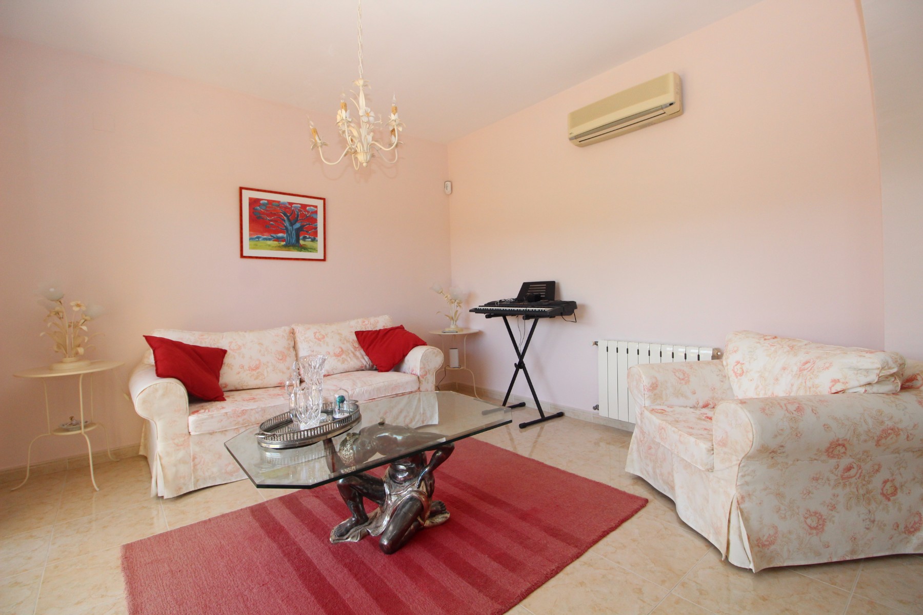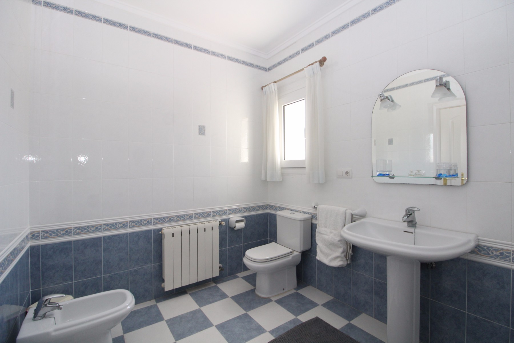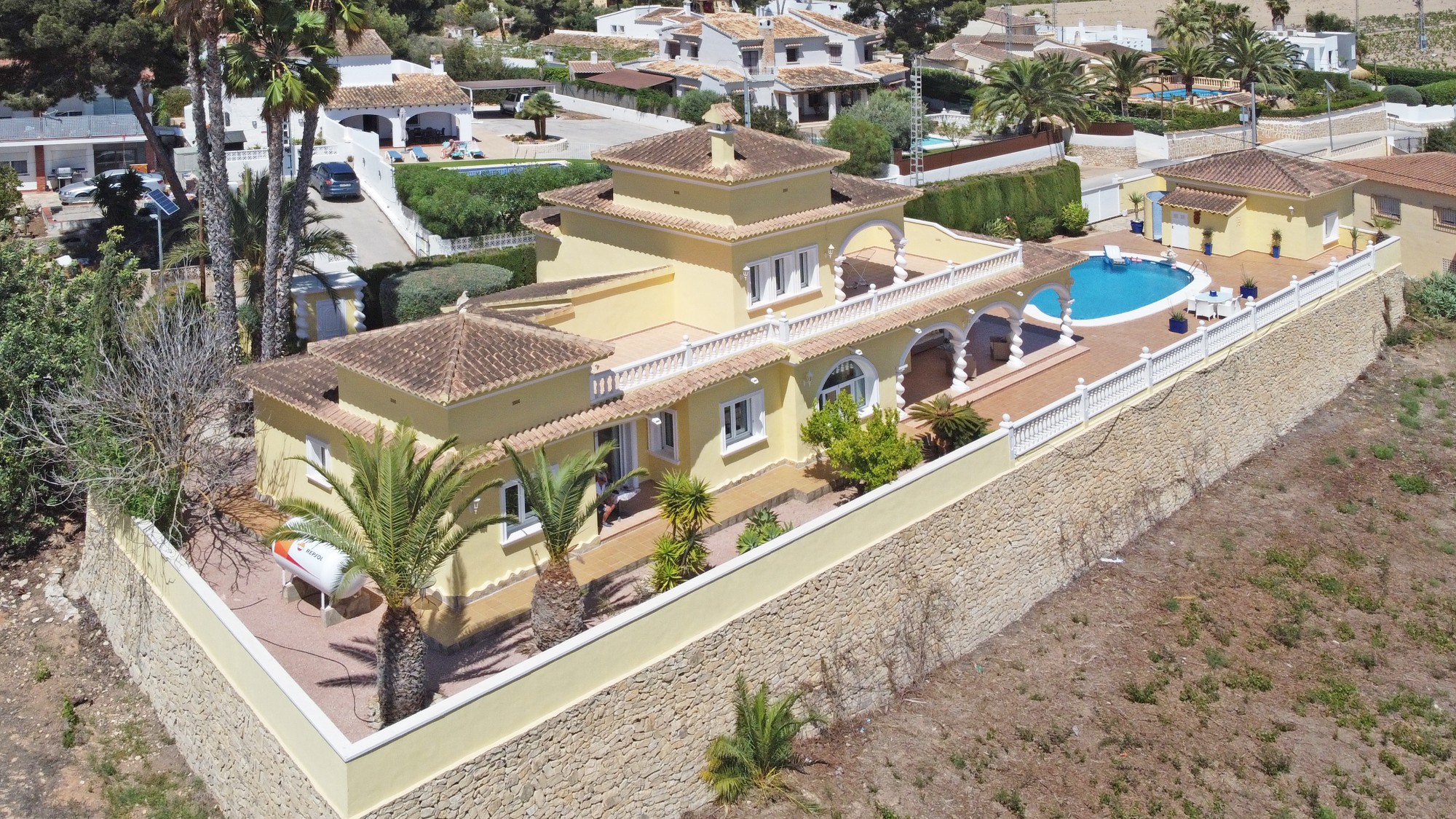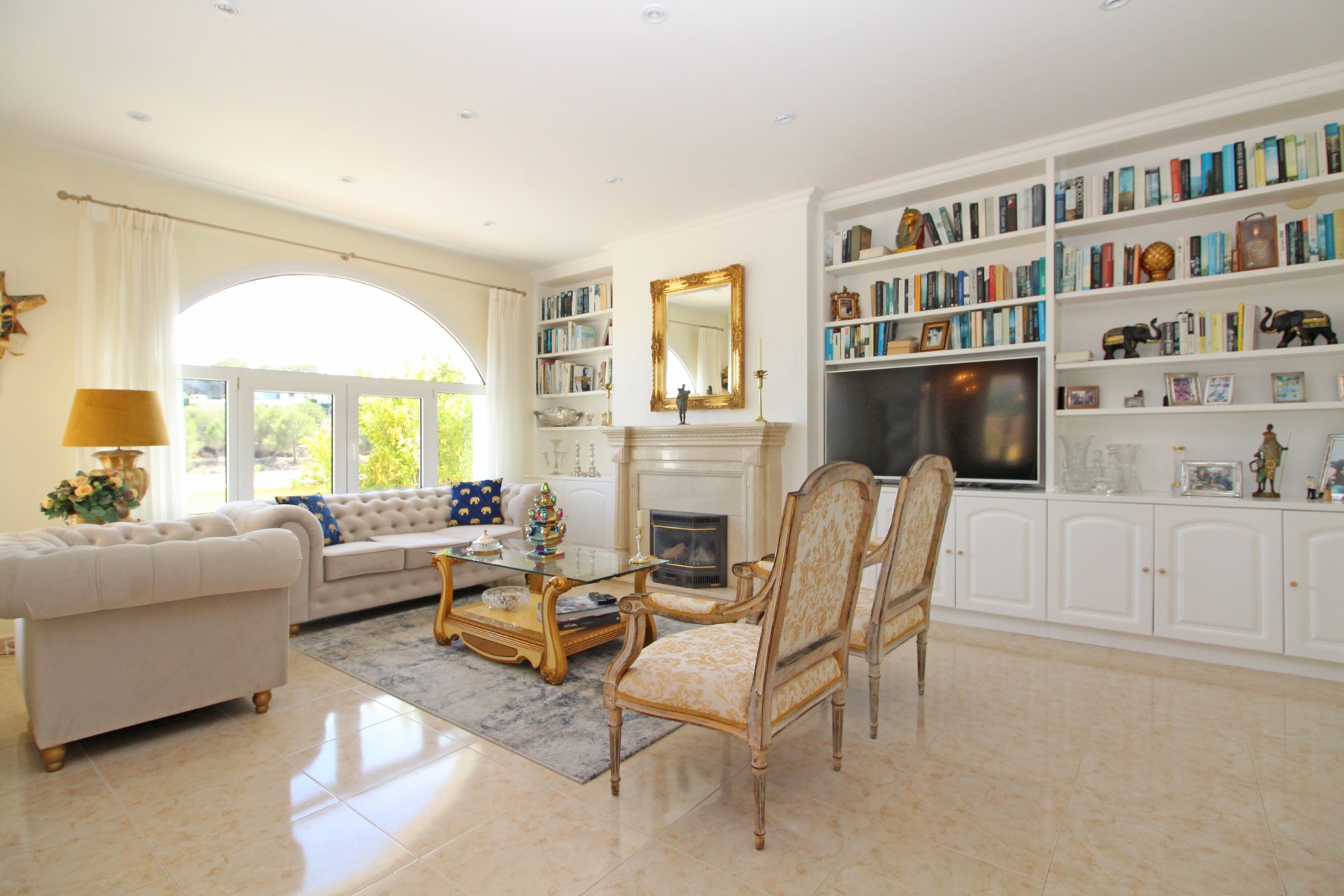 Discover this exceptional villa, ideally located just a 5-minute walk from both the beach and the village in Moraira. Upon entering the beautiful foyer, you will be greeted by an impressive entrance with double doors leading to the spacious living and dining room, adorned with a marble fireplace mantle with a gas fireplace and a custom-made wall unit, offering both comfort and elegance. A sliding door provides access to the covered terrace, seamlessly blending indoor and outdoor living. To the left of the foyer, a hallway leads to the fully equipped kitchen with ceramic hob, fridge-freezer, and dishwasher. From the kitchen, you can access the covered terrace and another terrace. This hallway also houses the utility room with washing machine and a guest toilet. To the right of the foyer, you will find built-in wardrobes, a storage room, a bathroom with bathtub, a spacious guest room with a sitting area and access to a covered terrace, as well as another large bedroom with ample closet space and an en-suite bathroom with bathtub. The impressive marble staircase from the foyer leads to the upper floor where the master bedroom awaits, complete with a walk-in closet and an en-suite bathroom with walk-in shower and bathtub. This bedroom offers access to a large covered and open terrace, ideal for enjoying the views. Step into the luxury lifestyle through the covered terrace on the ground floor, featuring a lounge and barbecue area complete with dining table, all overlooking the expansive 6 x 12m swimming pool. Surrounding the pool is a large south-facing terrace, with plenty of space for multiple sun loungers, ensuring relaxation under the Mediterranean sun. Access to the spacious garage, equipped with an automatic sectional door, is seamlessly facilitated through the automatic entrance gate. Additionally, you can enjoy the convenience of an outdoor shower. There is also a technical room for the pool. This beautiful property is equipped with gas central heating (gas tank), providing year-round comfort, along with air conditioning for added convenience. Take advantage of the benefits of double glazing and automatic shutters in the bedrooms, providing both insulation and security. LED recessed lighting adorns the interior, creating a welcoming atmosphere. Effortlessly control the pedestrian gate, automatic gate, and garage door from the house. Furthermore, you can rest assured knowing that the property is secured with a connected alarm system. To promote both safety and aesthetics, the entire plot is illuminated with outdoor lighting, while the villa is embraced by carefully maintained Mediterranean gardens, adorned with mature trees. Enjoy the beauty of nature and the proximity to the village and beach, making this property a serene oasis in Moraira. Contact us for an exclusive viewing and experience firsthand the unparalleled luxury and tranquility that this property has to offer. We look forward to welcoming you and helping you find your dream home in Moraira.