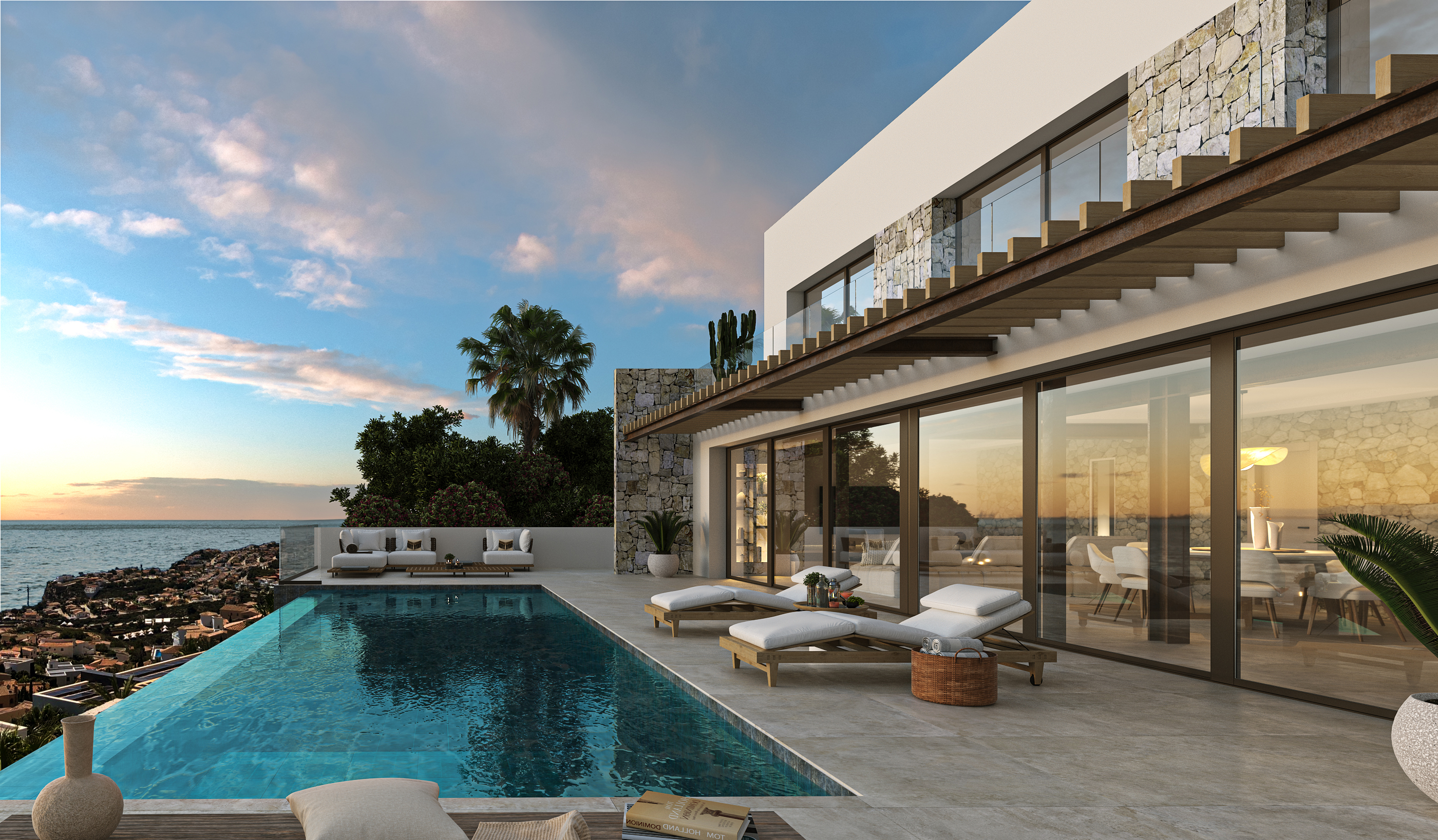 Welcome to this beautiful newly built villa in the Dalias area of Cumbre del Sol, Benitachell. This property is within walking distance of the Lady Elizabeth school and and a coffee shop for your first coffee and pastries in the morning. The Pepe La Sal supermarket and other amenities are not far away either. Want to go to the beach or the village? You can reach it in 10 minutes by car. Enter this unique villa with panoramic sea views through the electric entrance gate. One will find off-road parking and a carport for up to 3 cars! On the ground floor, the eye-catcher is the beautiful open, fully equipped kitchen with island. Next to the kitchen is a laundry room/utility room. Large windows with electric curtains open from the living room onto the terrace. An infinity pool with beautiful sea views! To finish it off, outside we of course find an outdoor shower and an outdoor kitchen. Again, on the ground floor there is also an office and a guest toilet! We take the stairs up and find 3 double bedrooms each with fitted wardrobes and electric shutters and curtains and access to their private balcony with panoramic sea views! The master bedroom has a dressing room and ensuite bathroom. Downstairs there is a fourth bedroom with bathroom and private terrace. Below the pool there is a space of +- 25m2 that you can give your own interpretation. For example, a home cinema or a spa. The villa has a home automation system, alarm with cameras, underfloor heating, inverter air conditioning with dehumidifier and pre-installation for solar panels. Key features: Unique villa with stunning sea views 4 bedrooms, 3 bathrooms + guest toilet OfficeInfinity pool, living room and kitchen on the same level Summer kitchen25m2 hobby room Pantry and storage roomUnderfloor heating, Air condition hot and cold with dehumidifier function and pre-installation for solar panelsAlarm with cameras and home automation Carport for 3 cars Electric shutters and curtains The villa is ready to move into and is currently being furnished, book your appointment now to go and view this beautiful move-in ready villa with sea views!